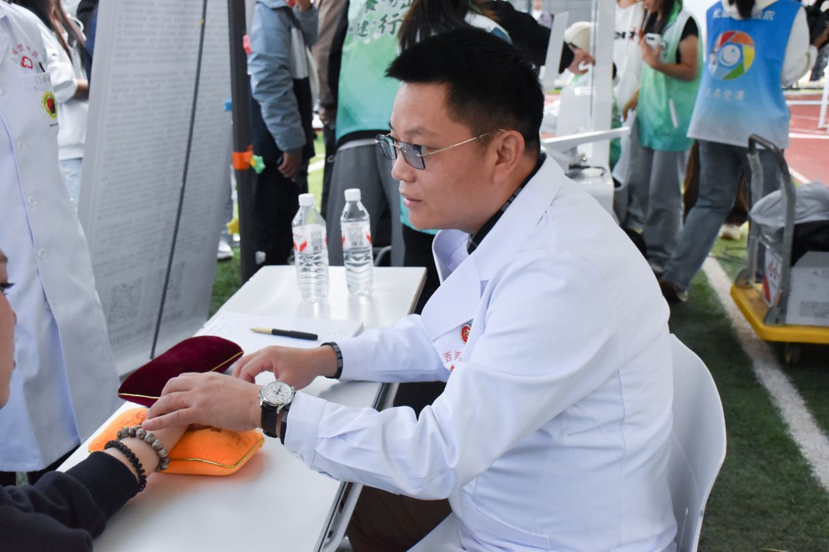 “舌淡红、苔薄白——昨晚又熬夜刷题没跑了吧?”中医义诊区的队伍蜿蜒绕圈,同学们攥着手机踮脚排队,就为等执业中医师唐海清医生“把把脉、看舌苔”。