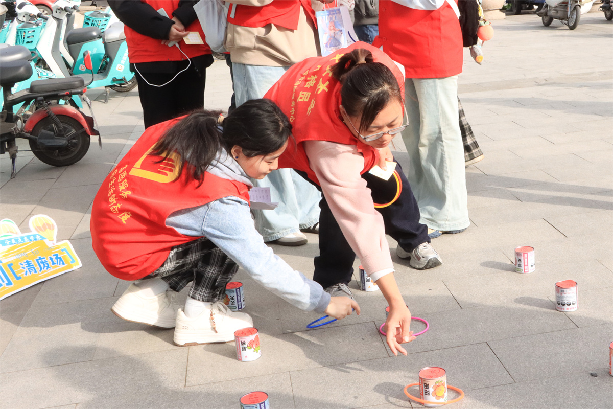 旧衣服的纤维里藏着可回收的潜力,碎玻璃的棱角下是循环的密码,连皱巴巴的毛巾、过期的化妆品,都成了考验眼力与知识的“谜面”。大家攥紧圈环,眼神里既有游戏的雀跃,又藏着对分类答案的期待,每个被瞄准的物件都是一把通往环保认知的密钥。即便偶尔分类偏差,志愿者也会用通俗易懂的讲解“补位”,让知识不再悬浮。参与者们不再是被动的聆听者,而是主动的探索者,甩动圈环的瞬间,思绪也跟着飞驰,大家化身绿色生活的“解码人”,合力拆解垃圾分类这道与日常休戚相关的“生活课题”。