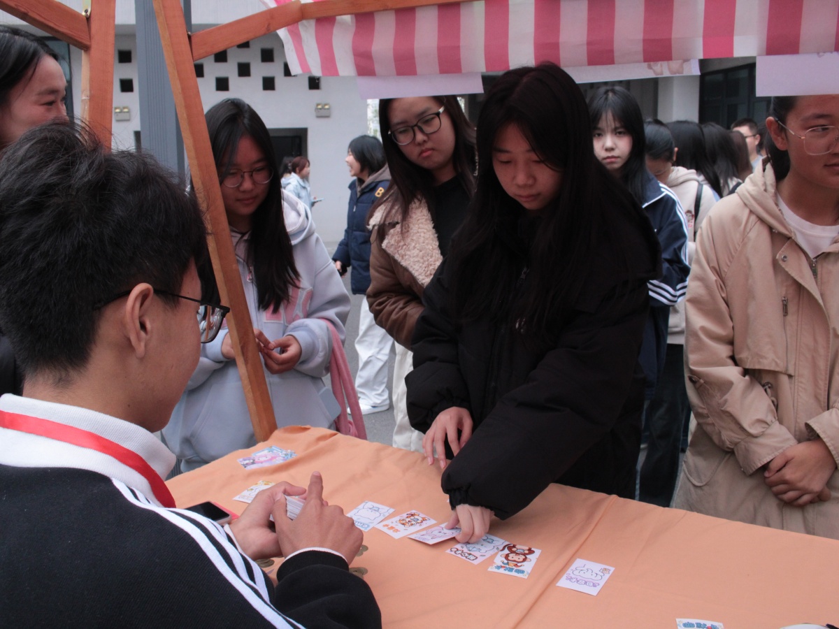 把喜欢的颜色,编进能随身携带的时光里。多巴胺手绳DIY区毫无疑问成为全场的人气担当!五彩斑斓的绳线在同学们灵巧的指尖穿梭飞舞,各式字母珠子与可爱挂件点缀其间,每一根绳线的缠绕、每一颗珠子的串联,都在勾勒独一无二的幸运手环。围坐桌前的身影各有专注,初学的同学紧盯志愿者的示范动作,指尖跟着慢动作起落,从生疏地绕线到逐渐掌握节奏,每一步都藏着对“亲手创造”的郑重;熟稔技巧的同学则带着巧思创作,先将刻有名字首字母的珠子稳稳穿入绳中,再细心挂上小巧铃铛,抬手晃动时,清脆声响里满是对个性表达的雀跃。更贴心的是,只要凭一枚活动特制的铜色纪念币,就能免费带走自己亲手制作的手绳,让这份快乐有了专属“信物”。