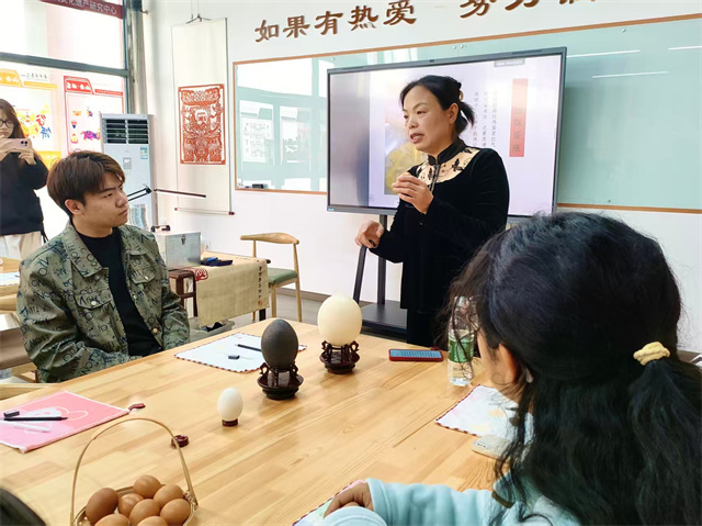 活动正式启动后,符润娥老师首先为在场学生带来生动讲解。从蛋雕技艺承载的千年匠心历史,到其“以蛋壳为纸、刻刀为笔”的东方美学特色,再到本次活动的具体操作流程与安全规范,内容清晰详实。这一环节不仅帮学生快速建立对蛋雕非遗的认知,更激发了大家动手创作的期待,为后续实践环节做好铺垫。