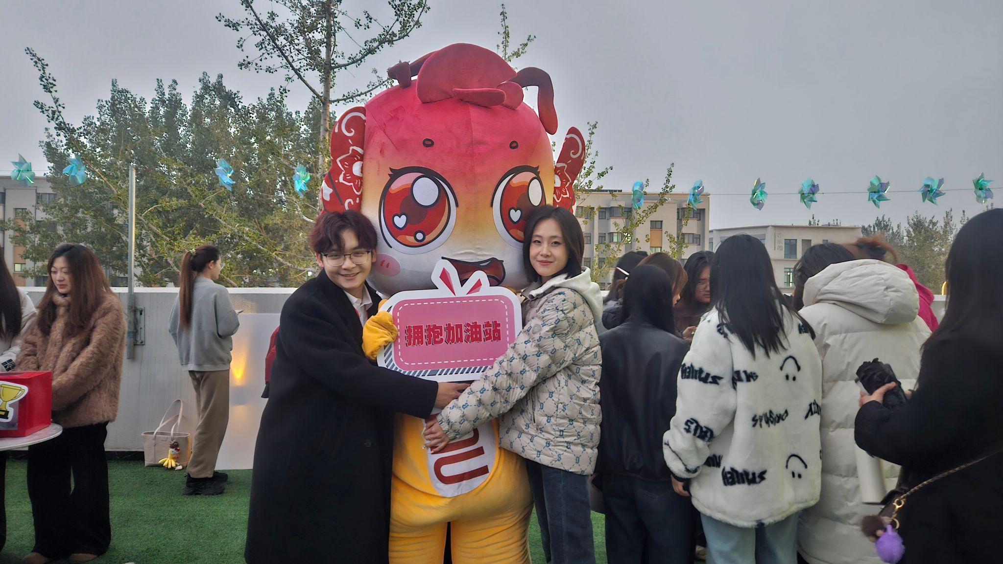 “欢迎来抱!”穿着萌系玩偶服的志愿者刚站定,就被同学们团团围住。可爱的外表和毛茸茸的质感引得大家纷纷驻足,短短几分钟,“拥抱加油站”成了这里最温暖的角落。