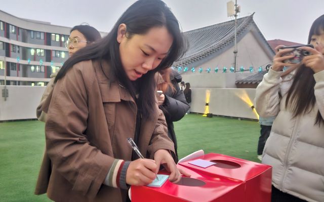 “烦恼箱”和“祝福箱”刚摆好,蓝色、粉色便利贴就像小蝴蝶一样飞进箱子里。“发言总紧张”“和室友闹别扭了”……烦恼被悄悄投递;而粉色便利贴上,“你超棒的!”“明天一定有好事发生!”的祝福越来越多。