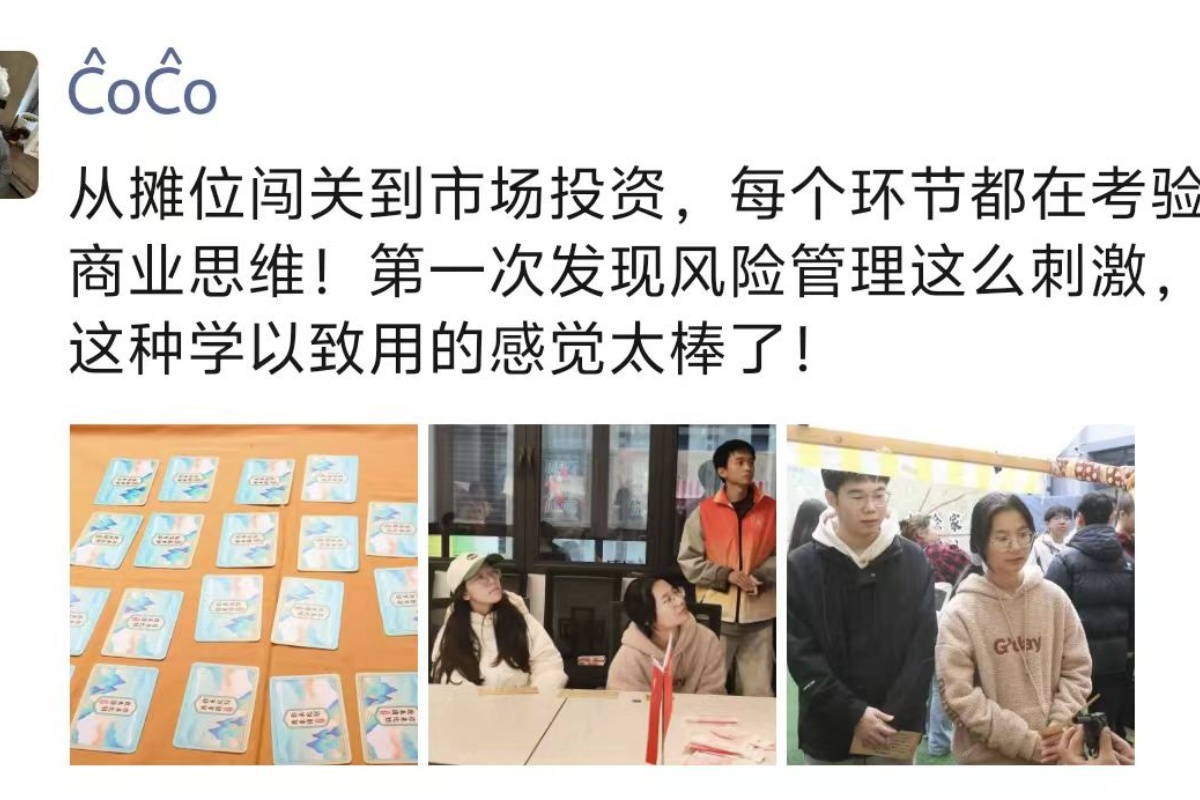 淬炼商学院·国际商学院一同学:“从摊位闯关到市场投资,每个环节都在考验商业思维!第一次发现风险管理这么刺激,这种学以致用的感觉太棒了!”