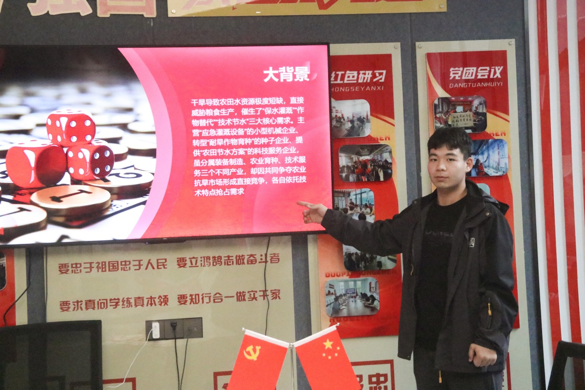 当初始资本积累至一定程度,真正的考验在104逐浪·功能性党支部拉开序幕。投资区特意设置了以“台风、疫情、干旱”为背景的三类风险标的,精准还原现实商业环境中的不确定性。一位淬炼商学院·国际商学院的同学在低风险标的前驻足良久,最终将60%资金投入基建行业:“虽然收益平稳,但遇到干旱时农业受损,基建反而会受益。”