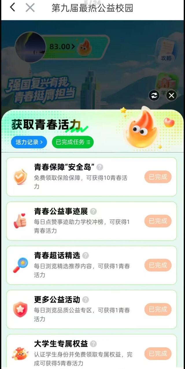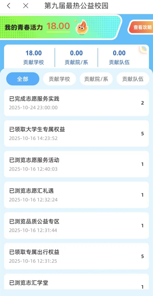10月18日,第九届最热公益校园“益动青春”主题活动温情启幕。活动以“强国复兴有我,青春挺膺担当”为宗旨,依托志愿汇平台,实现公益时长高效记录、公益故事实时分享、公益资源多元联动,旨在激发青年社会责任感,让青春在公益实践中绽放璀璨光彩,为强国复兴注入蓬勃青春力量。活动自启动以来,得到大家的热烈响应与积极支持,吸引近三千人报名参与。这份踊跃参与的热情,不仅彰显了青年群体对志愿服务事业的赤诚与热忱,更用实际行动诠释了新时代青年的责任担当,让奉献、友爱、互助、进步的志愿精神在校园沃土中深深扎根、薪火相传。