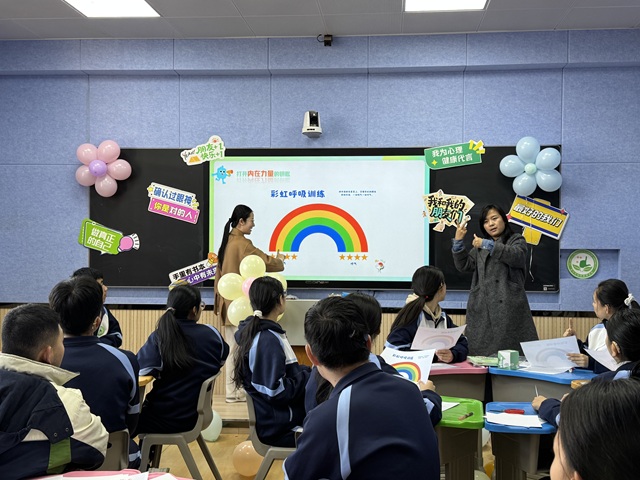 难道高三只剩试卷堆叠的焦虑、备考冲刺的紧张吗?不!今天心理健康教育中心刘美君老师用自带疗愈的话语带我们的心去没有天花板的地方,在晋中市特殊教育学校手语老师的“翻译”下,她通过“彩虹呼吸训练”让同学们放松身心,引导大家跟着节奏移动手指,在一吸一呼间舒缓紧绷的神经。