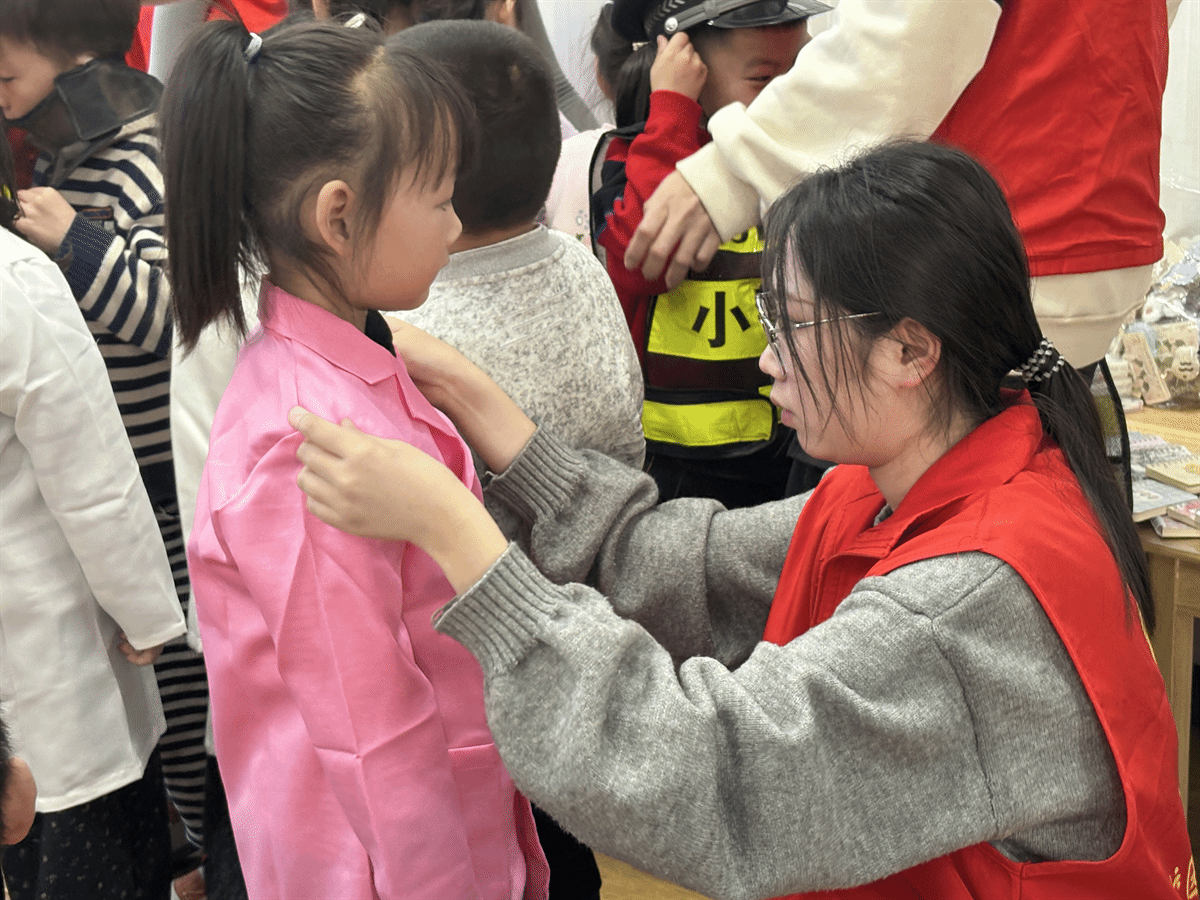 从故事的聆听者化身为故事的主人公,小朋友们穿上制服让抽象的“职业”概念瞬间变得可感可触,DIY职业机关书与拼图的过程中,他们用指尖的探索解构不同职业的奥秘,亲手触摸梦想的形状。于志愿者而言,此刻的角色已从讲述者转变为温暖的守护者与观察者,他们协助孩子们穿戴“行头”,见证着稚嫩脸庞上绽放的认真光芒;他们引导小手完成拼图,仿佛也拼接起自己曾经散落的初心。这场沉浸式体验,不仅是陪伴孩子将梦想具象化,更是一次对自我成长的温柔反刍——在童真的映照下,重新品味选择与担当的重量。