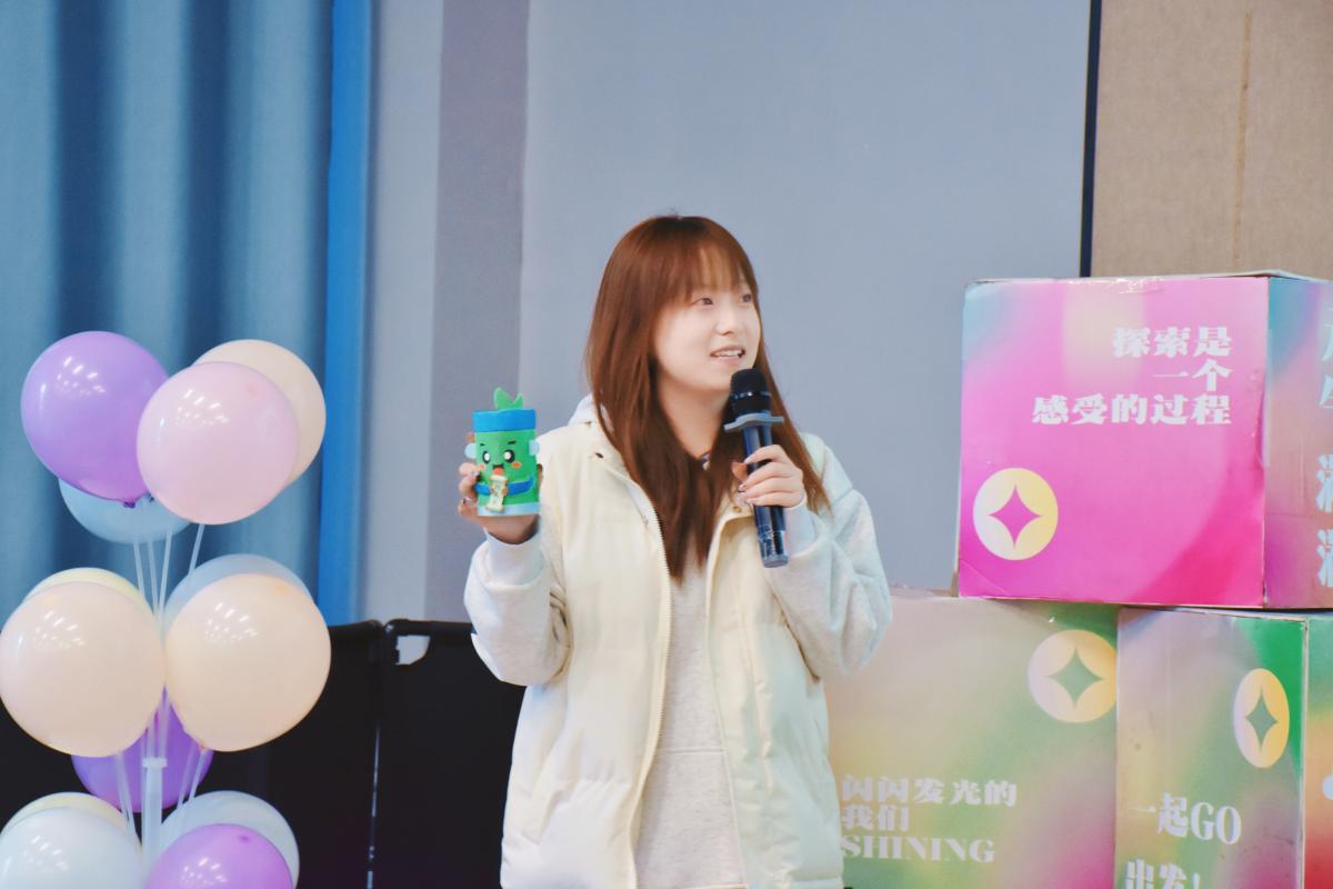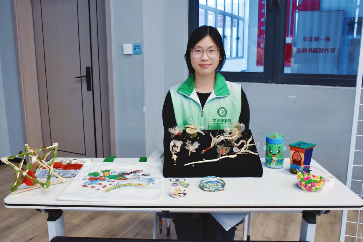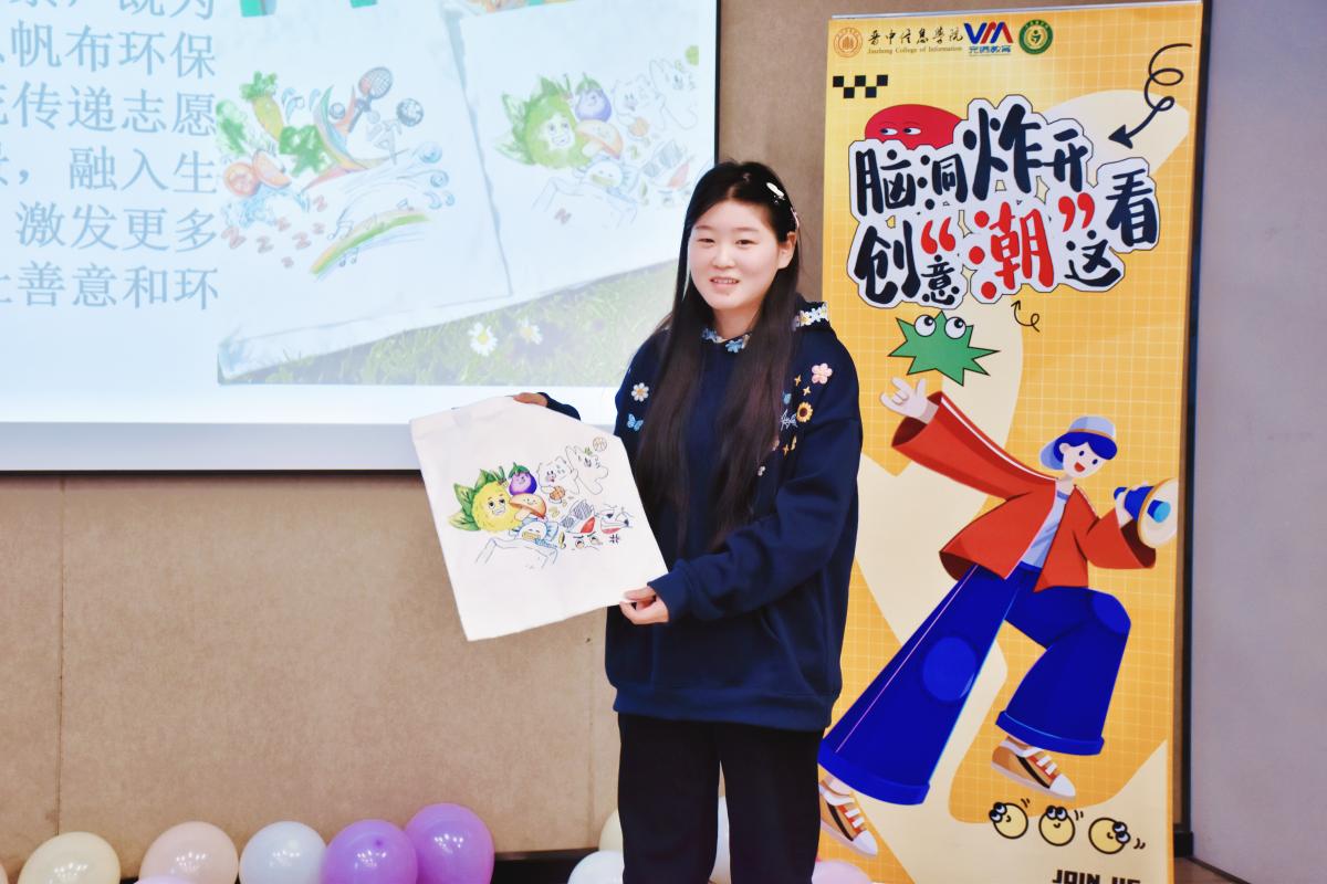 决赛现场氛围热烈,灯光聚焦下的展示台成为创意秀场,各团队详细阐述作品的设计理念、制作过程与健康内涵,将专业特色与美学设计完美融合。“Book思议队”的“轻养·简趣笔筒”惊艳全场:以废弃快递盒为基底,经精密切割拼接塑成极简造型,绿蓝主色调暗合环保主题,缀“轻养生”卷轴与萌芽符号,内置可拆分收纳格,适配书桌雅境;“晨曦队”的“小麦仔”“果小鲜”IP形象萌趣吸睛,亚克力摆件以明丽色彩诠释天然食材健康真谛;“青翠绿动队”的花艺装置用金属丝勾勒框架,嵌入鲜干花搭配灯光,碰撞自然意趣与几何美学;“微光志愿队”的环保帆布包双面承载健康主题,大容量耐磨设计兼具格调与实用性。