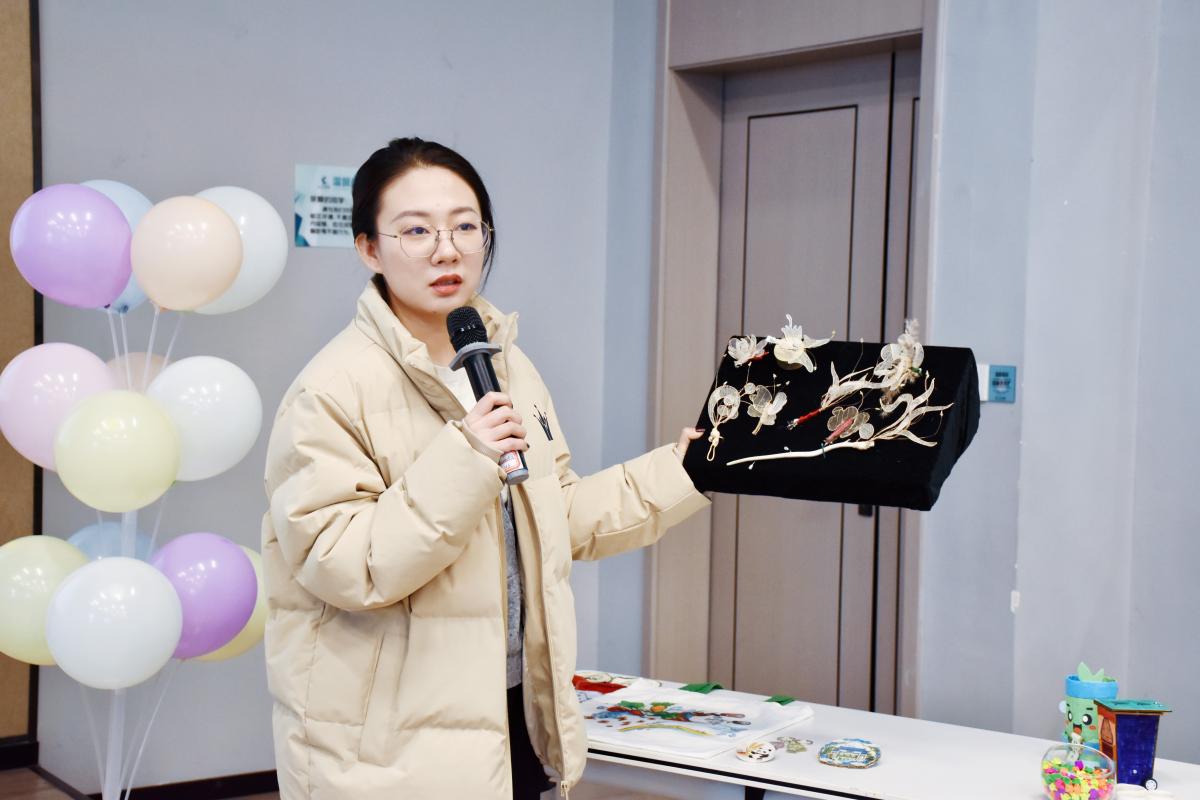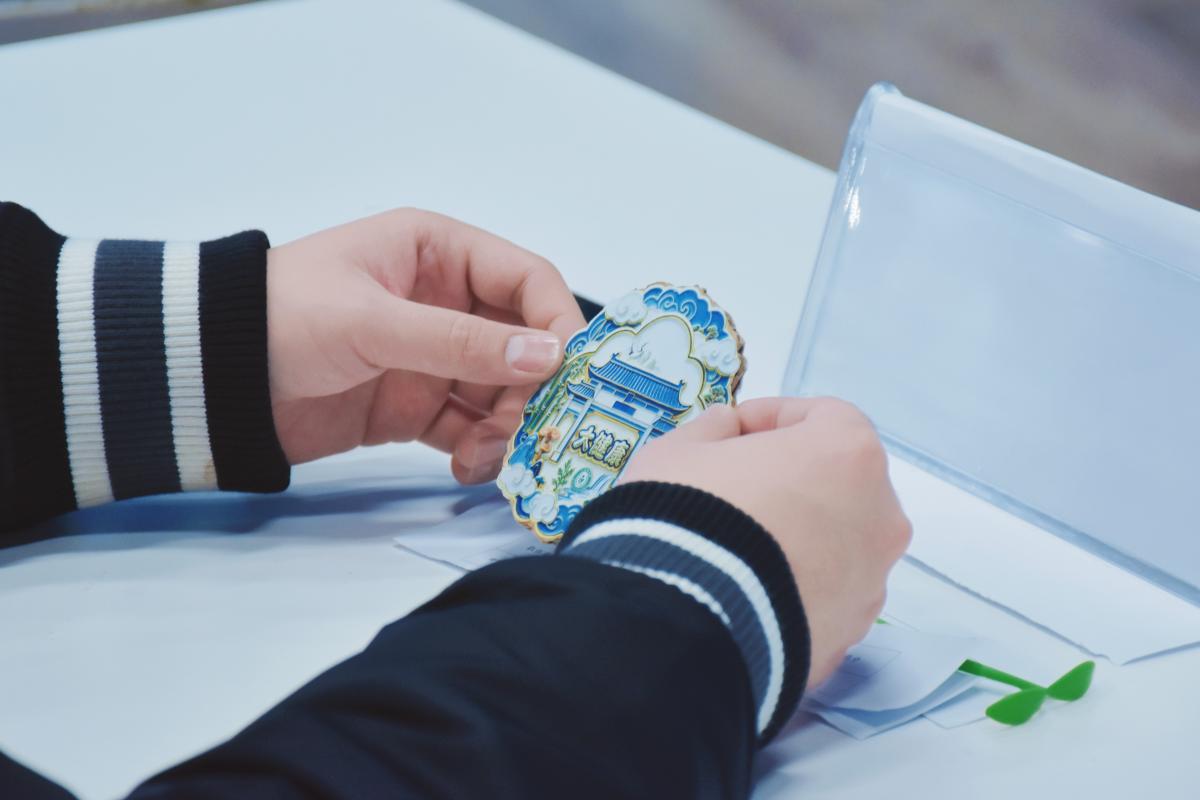 互动环节中,主持人邀请现场同学行使“心动选择权”:“哪款作品让你一见倾心?哪份创意最能打动你?请拿起手中的星星贴纸,把这份偏爱贴在心仪作品下方的彩纸上,让每一颗星星都成为创意的‘点赞勋章’!”最终,“叶叶暴富队”的“叶脉国风饰品”斩获“最佳人气奖”。作品以校园落叶为原料,经多道工序化作花蝶形饰件,浅金米白暖调晕染自然灵韵,原生肌理与手工掐丝相映成趣,既践行“让落叶重生”的环保初心,更以东方美学诠释共生理念。