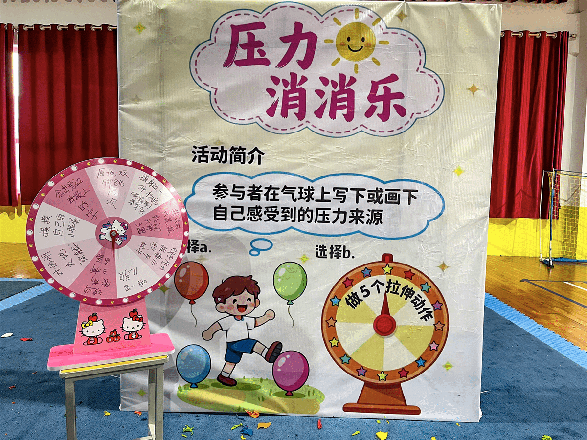 成长路上难免有着细碎的烦恼,那些藏在书包里的焦虑、压在心头的小委屈,总需要一个温柔的出口。“压力消消乐”,便成了烦恼的“出口驿站”。孩子们将“作业堆成的小山”“考试后忐忑的心跳”“和朋友闹别扭的委屈”,一一画在气球上,使劲儿踩下,让烦恼随“砰”的一声消散在风里;转动“减压妙招”转盘,跟着指示做一次深呼吸,让气息带着焦虑缓缓吐出。志愿者们在旁轻声引导:“烦恼不是洪水,只要找到与它相处的方式,就能把它赶跑。”