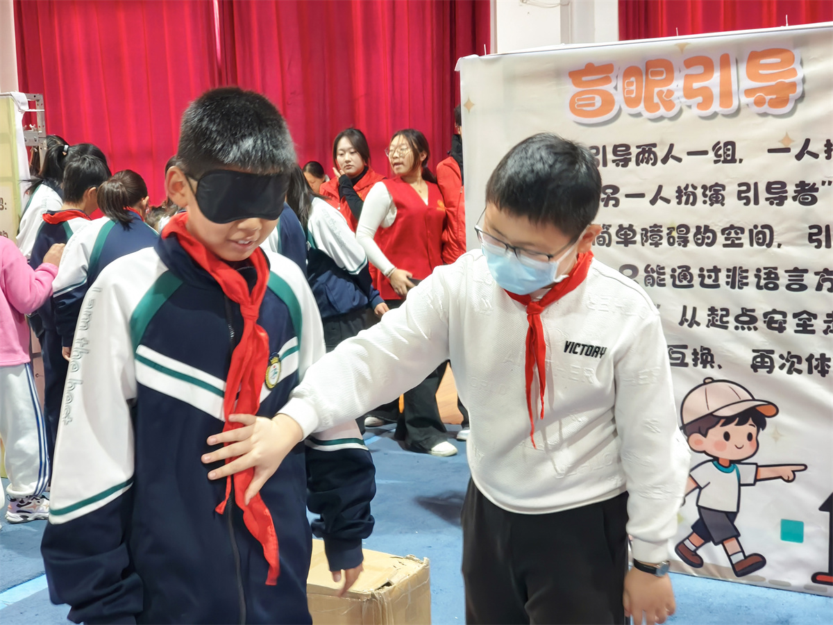 “盲眼引导”的游戏里,信任是看不见的桥梁。当“盲人”闭上双眼,世界瞬间陷入黑暗,“引导者”的轻触、肩膀的轻拍,便成了最可靠的方向,不能说话的默契里,藏着最纯粹的守护。孩子们小心翼翼地带领同伴前进,生怕对方摔倒;角色互换后,又亲身体会到“被人稳稳守护”的温暖。