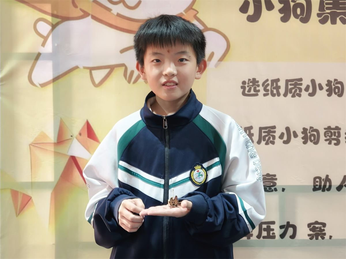 “小狗集市”的温馨,藏在指尖的每一次折叠里。孩子们从纸上剪下喜欢的小狗轮廓,小心翼翼地沿着折线折出耳朵、身体,用双面胶将头部与身体粘牢,像给心灵找了个柔软的伴。他们给纸小狗取名字——“开心”“小暖”,说“要把开心事都讲给它听”“写作业时让它坐在旁边,就像有好朋友陪着”。