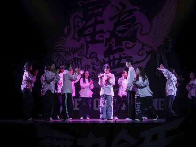 集体Battle的鼓点如惊雷炸响,往届老队长与毕业骨干们热血回归——舞台瞬间化为他们的“战场”。没有寒暄,只有肢体间的对话。一位老队长率先出招,Breaking动作力道凶悍却依旧行云流水;现任队长立刻接招,用更复杂的脚步与旋转回应。Popping的对决中,肌肉震动频率快如连珠,你来我往间仿佛无声的“对话”。这不是表演,是纯然的交锋;没有输赢,只有全力以赴的敬意。