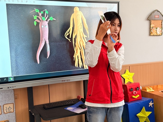 绘本PPT一页页展开,甘草的黄褐枝条、人参的土黄根茎在屏幕上“活”了过来——小朋友们瞪圆眼睛,伸着小手比划“人参的帽子像小山”“甘草是细细的长棍”。当志愿者问到“谁见过这些植物呀?”几只小手举得比人参“帽子”还高:“我奶奶泡过甘草水!”本土草木的亲切感,一下把孩子们拉进了故事里。