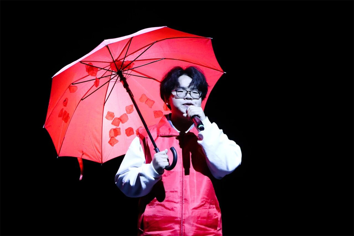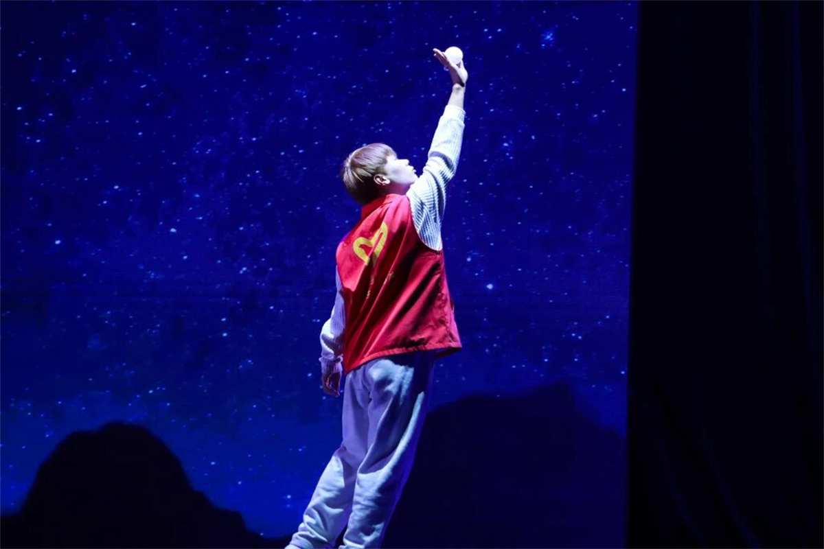 更令人动容的是,来自艺术传媒学院的现代舞者刘一凡以身体为语言,穿梭于四个篇章之间。从晨光熹微时的苏醒伸展,到星光闪烁时的温柔收束,他以无声的肢体叙事,将志愿者平凡一天中的奔忙、疲惫、坚持与喜悦,演绎得丝丝入扣,让奉献的节奏拥有了可视的呼吸与心跳。