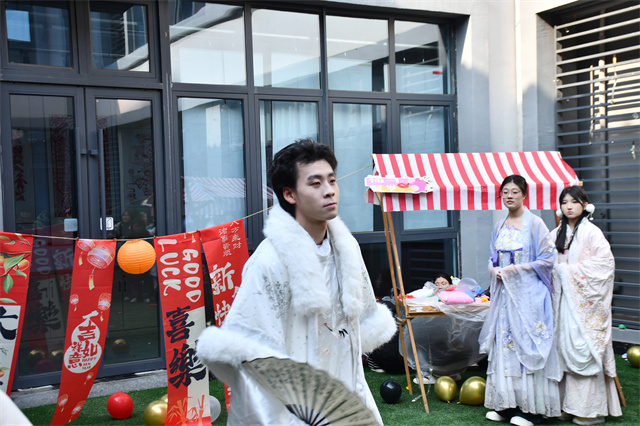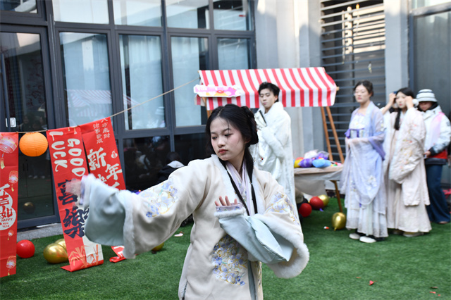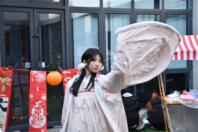 佳夜汉服社成员们一袭华裳,惊艳亮相。伴随悠扬乐声,她们翩然起舞,水袖轻扬、罗裙流转,宛如从古画中跃出的灵动篇章。舞蹈编排柔美中带着雅致,一举一动尽显传统仪韵,不仅吸引了层层围观,更引来镜头频频追随。这场即兴的国风舞蹈,让游园会瞬间多了几分如梦似幻的意境,也让大家在观赏中直观感受到中华服饰与舞姿交融之美。衣袂翩跹,宛如古画中人,成为镜头里最美的风景。