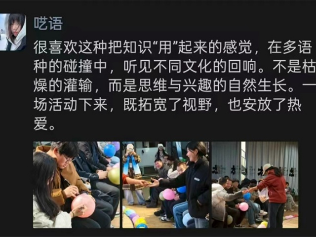 淬炼商学院·国际商学院一同学:“谁说学语言只能啃书本?这次活动简直是‘行走的教科书’!在玩乐中开口,在协作中进步,感觉我的外语细胞都被激活啦!不止是技能点UP,更是快乐值爆表的一天!”
