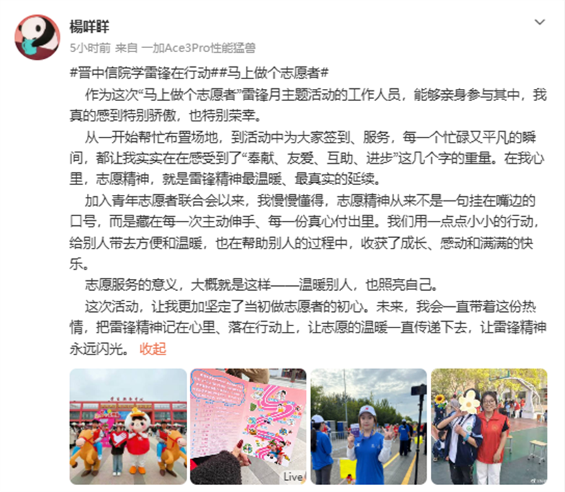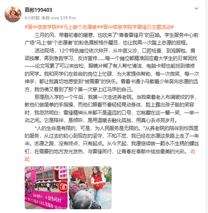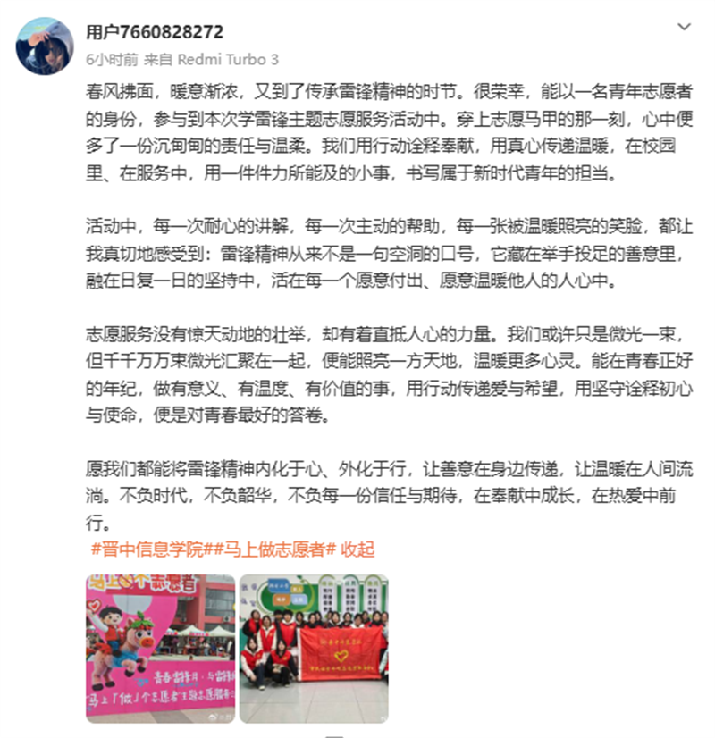 “马上做个志愿者”不仅是一句简单的互动口号,志愿服务也从来没有终点。本月,全校各级各类组织还将围绕“青春雷锋月”主题,集中开展60余项志愿服务活动,推动志愿服务热潮在校园内外持续升温。下一步,学校将在全面推进“志愿者之校”建设的进程中,持续搭建多层次志愿平台、培育专业化志愿队伍、完善常态化保障机制,推动志愿服务工作更接地气、更有活力,让志愿精神融入日常、成为习惯,引导广大青年学生在服务他人中读懂责任,在奉献社会中收获成长。