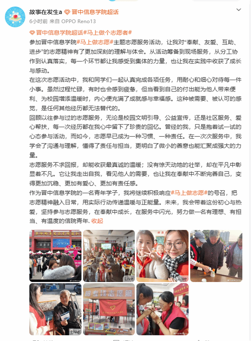 当线下的集章打卡活动缓缓落下帷幕,另一场关于善意的传递却在更广阔的虚拟空间里悄然升温。同学们纷纷在朋友圈、微博晒出手中盖满印章的集章卡,分享自己在“马上‘做’个志愿者”活动现场的所见所感。而随着话题#马上做个志愿者#以10W+的阅读量登上全国高校和同城微博热搜,这些原本只停留在校园里的青春故事,开始奔向千万网友的屏幕前。
