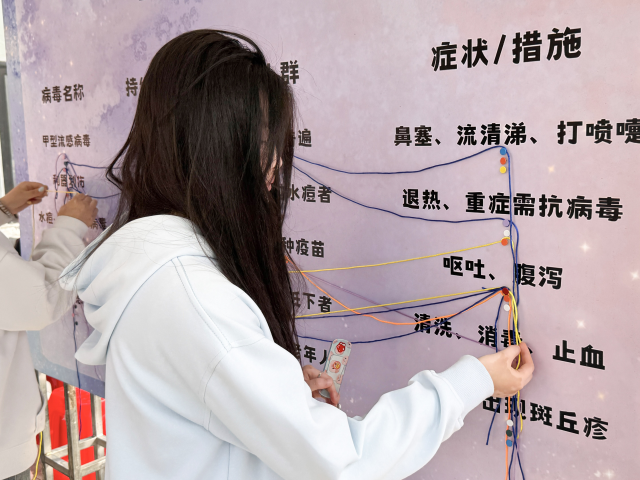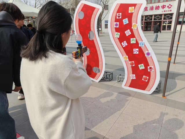 病毒保卫战正式打响!同学们瞬间切换“病毒狙击手”模式,精准锁定卡通病毒目标。紧接着,大家又化身“分类小能手”,将代表治疗方案的乒乓球精准投入对应分类桶。在这场欢乐十足的互动游戏中,晦涩的知识悄悄转化为趣味记忆,病毒特征与对症处理方式也在欢声笑语中深入人心。