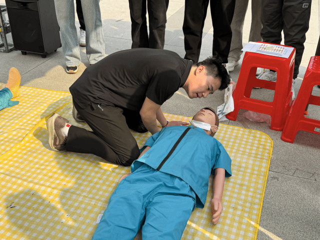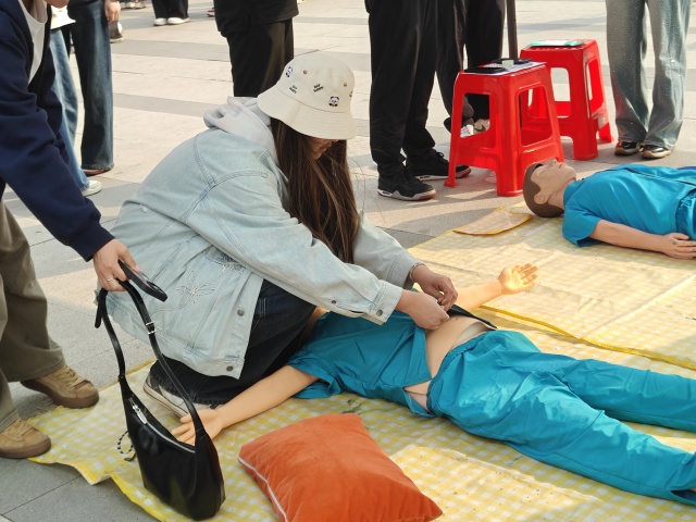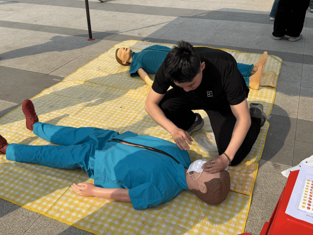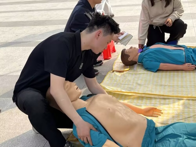 现场工作人员用通俗易懂的语言,结合生动的示范,手把手细致讲解心肺复苏、海姆立克急救法的核心要点与标准操作步骤,将理论知识与具体实操完美结合。大家聚精会神地观摩,时不时点头示意,随后亲身上手实操体验,按压、吹气、发力,每一个环节都认真模仿、反复调整,在沉浸式体验中慢慢熟练技巧,收获到满满的安全感与实用本领。