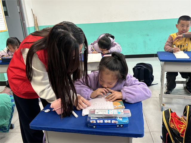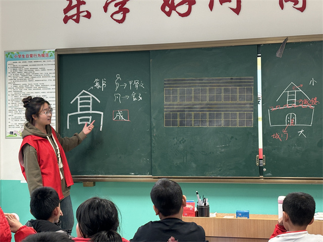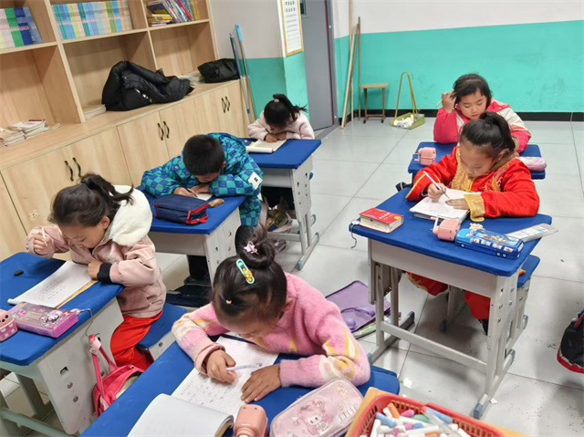 在硬笔书法教学环节,志愿者们从最基础的握笔姿势入手,耐心地纠正每一个孩子的错误姿势,确保他们能以规范的姿态开启书法学习之路。随后,志愿者们又细致地讲解了笔画的书写顺序、力度的把控以及字体结构的搭建等要点,孩子们全神贯注,跟着志愿者老师的示范,一笔一划地认真书写着,每当写出一个规范的笔画,孩子们都会露出灿烂的笑容,那笑容既是对知识收获的满足,也是对书法魅力初体验的欣喜。