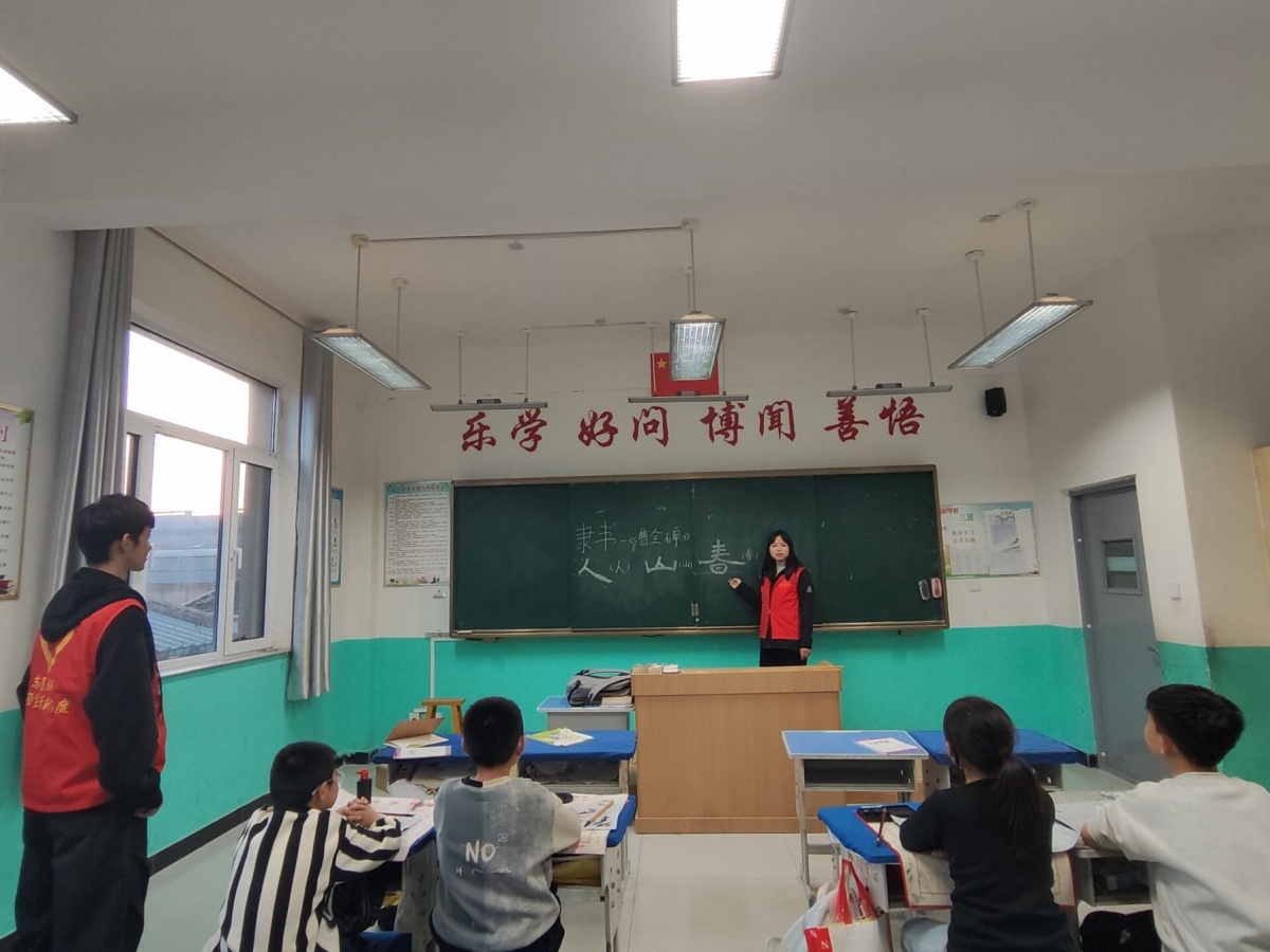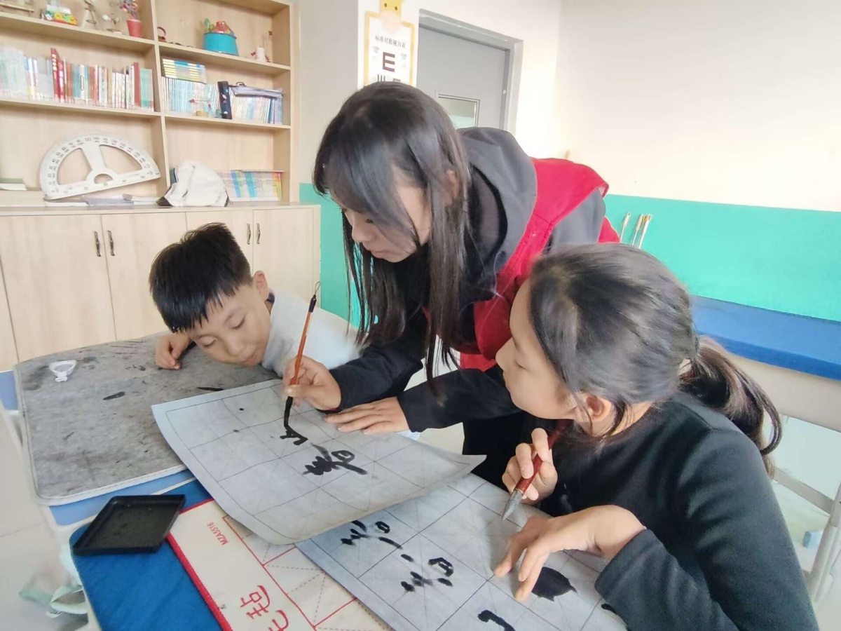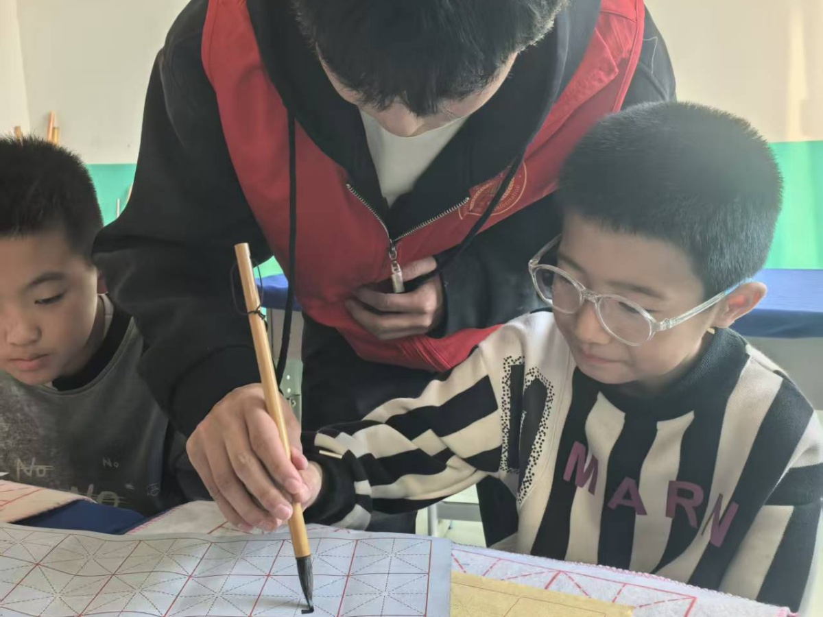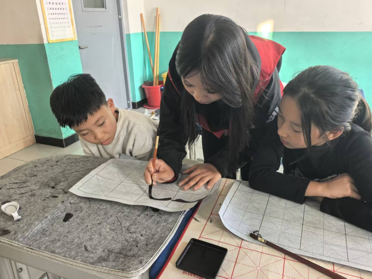 随着孩子们逐渐熟悉握笔,教学进入下一个阶段。支教成员从最基础的横、竖笔画开始教起,宣纸上的墨痕逐渐舒展,淡淡的墨香在教室里弥漫开来,孩子们则屏息凝神,跟着老师缓缓运笔。“笔要轻,行笔要稳,收笔要慢”,孩子们在老师的话语中专注地练习着,眼神中透着认真与投入。一旁的青年志愿者联合会的成员们积极配合,协助维持课堂秩序,及时为孩子们添墨换纸。整个教室沉浸在“教的用心,学的认真”的温馨氛围里。