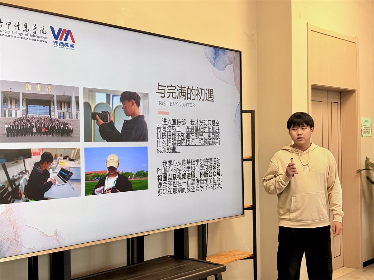 随后,主持人邀请郝章豹学长登场分享。学长以“邯郸学步”的典故切入,讲述自己运营抖音视频账号的经历。从初期的磕磕绊绊,到在完满教育的学习实践中逐渐蜕变成长,学长将过程中的收获与感悟娓娓道来。