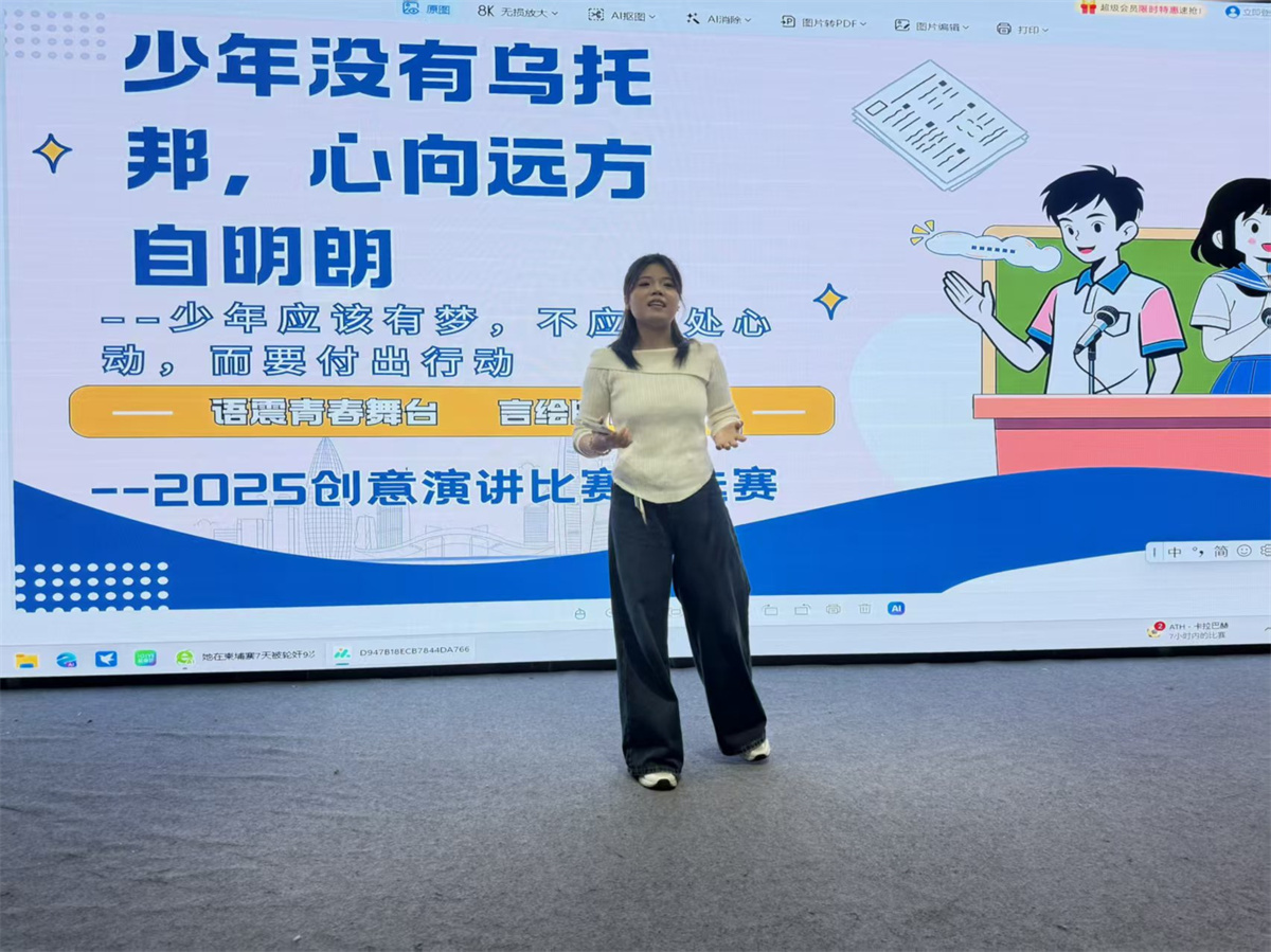 相较于先前那位同学慷慨的表现方式,接下来登台亮相的的同学则呈现出一种更为淡定自若的态度。他单手轻支讲台边缘,指尖随意搭在木质台面上,另一只手自然垂落,偶尔随着表述轻轻比划,这种既不失礼貌又能充分展示个人魅力的姿态赢得了现场不少人的青睐。讲“乌托邦里的教育模式”时,他把“刻板的涂鸦式教学”比作“上了发条的玩具”,将“自由探索的学习”形容为“追着蝴蝶奔跑的午后”,复杂观点在鲜活的比喻中,像风掀动书页般清晰透亮。