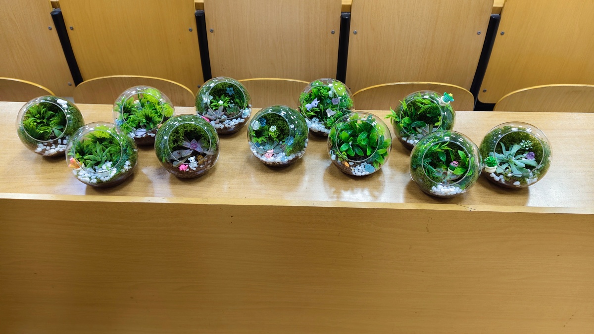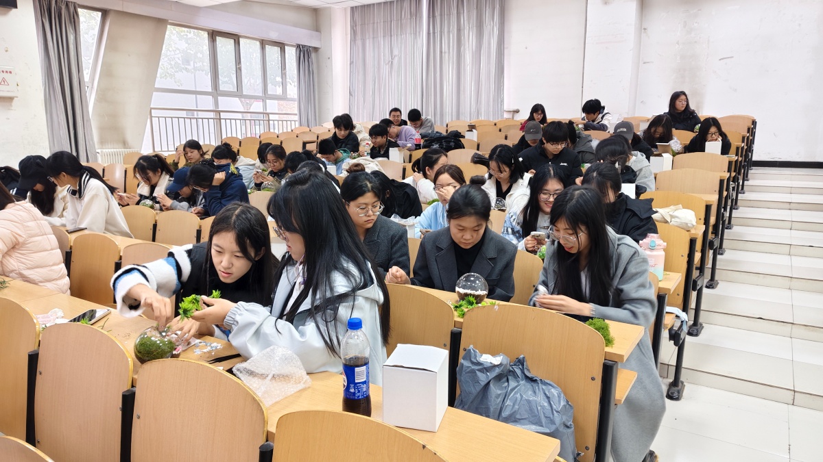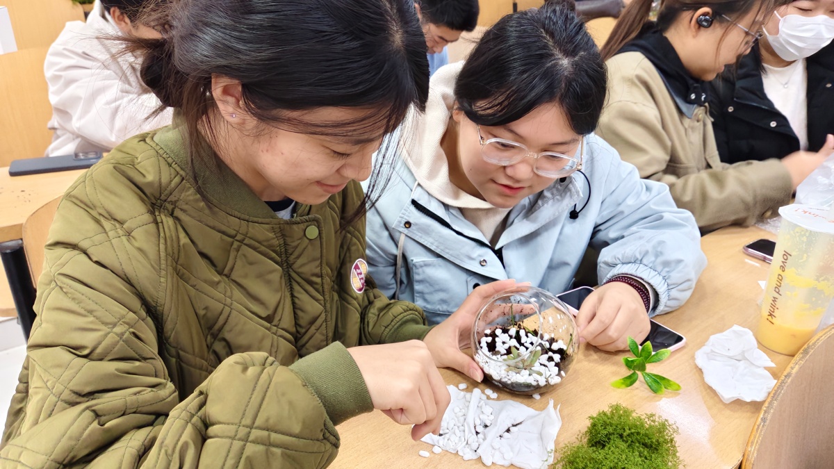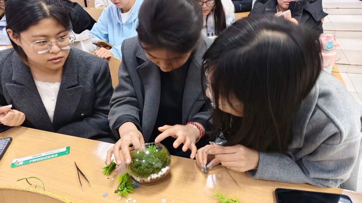 活动接近尾声,参与者们手持自己的作品合影留念,玻璃容器里的盎然绿意与脸上的洋溢笑意相互映衬,定格下温暖的瞬间。不少同学表示:“原来只要一点创意和耐心,就能把‘大自然’捧在手心!”。这场“瓶中微界·植趣新生”的创作之旅,不仅让师生们收获了专属的微景观作品,更在快节奏的校园生活里,辟出一方慢下来感受自然的小天地——毕竟,能把“森林”“沙漠”装进玻璃瓶的魔法,本就足以让平淡日常焕发生机,让自然之美与创意之光,照亮每一个平凡的日子。