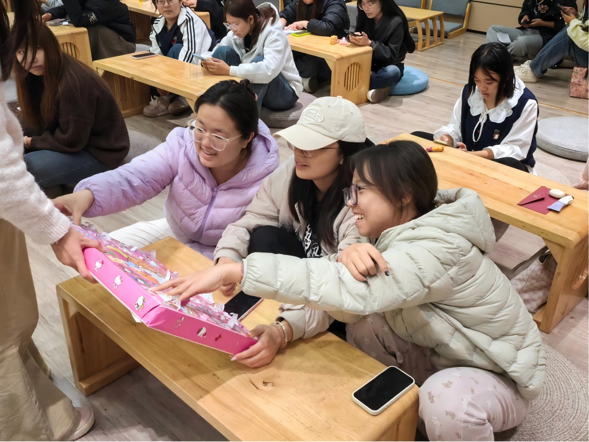“盲盒抽卡互动”不仅有趣味性,更藏着满满的实用干货。盲盒箱里的“奖品卡”“雷区卡”“空卡”三类卡片,每一张都对应着不同的权益话题。同学们依次上台抽卡,从指尖触到卡片的紧张,到翻开卡片的期待,全程充满参与感。抽到卡片后,大家会结合自身经历展开讨论,分享成功维权的经验,在交流中相互学习。