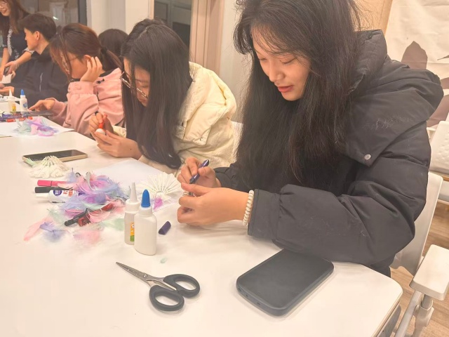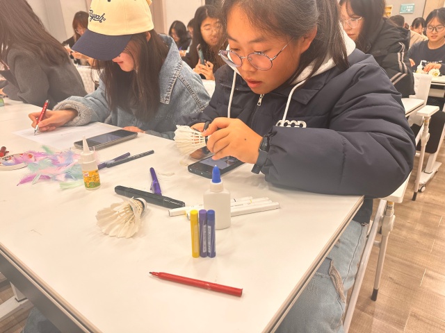 活动现场,一段揭示羽毛球生命周期的短片,将大家的思绪从赛场引向更广阔的环境议题。随着灯光再次亮起,同学们纷纷拿起工具,开始了这场特别的“再造之旅”。拆解、分类、构思……每个人都全神贯注,手中的羽毛球逐渐褪去原有的形态。羽毛在指尖被细心排列、粘贴,化为一对对翩然欲飞的蝶翼;圆润的球托则与羽毛巧妙结合,绽放成朵朵立体花卉。人群中,一位来自智能工程学院的同学将多个球托层叠组合,构成一只展翅的蝴蝶,独特的创意引来周围同学的连声赞叹。原本被遗忘的废弃物,此刻被赋予全新的形态与意义,在专注与创造中完成了温暖的再生。