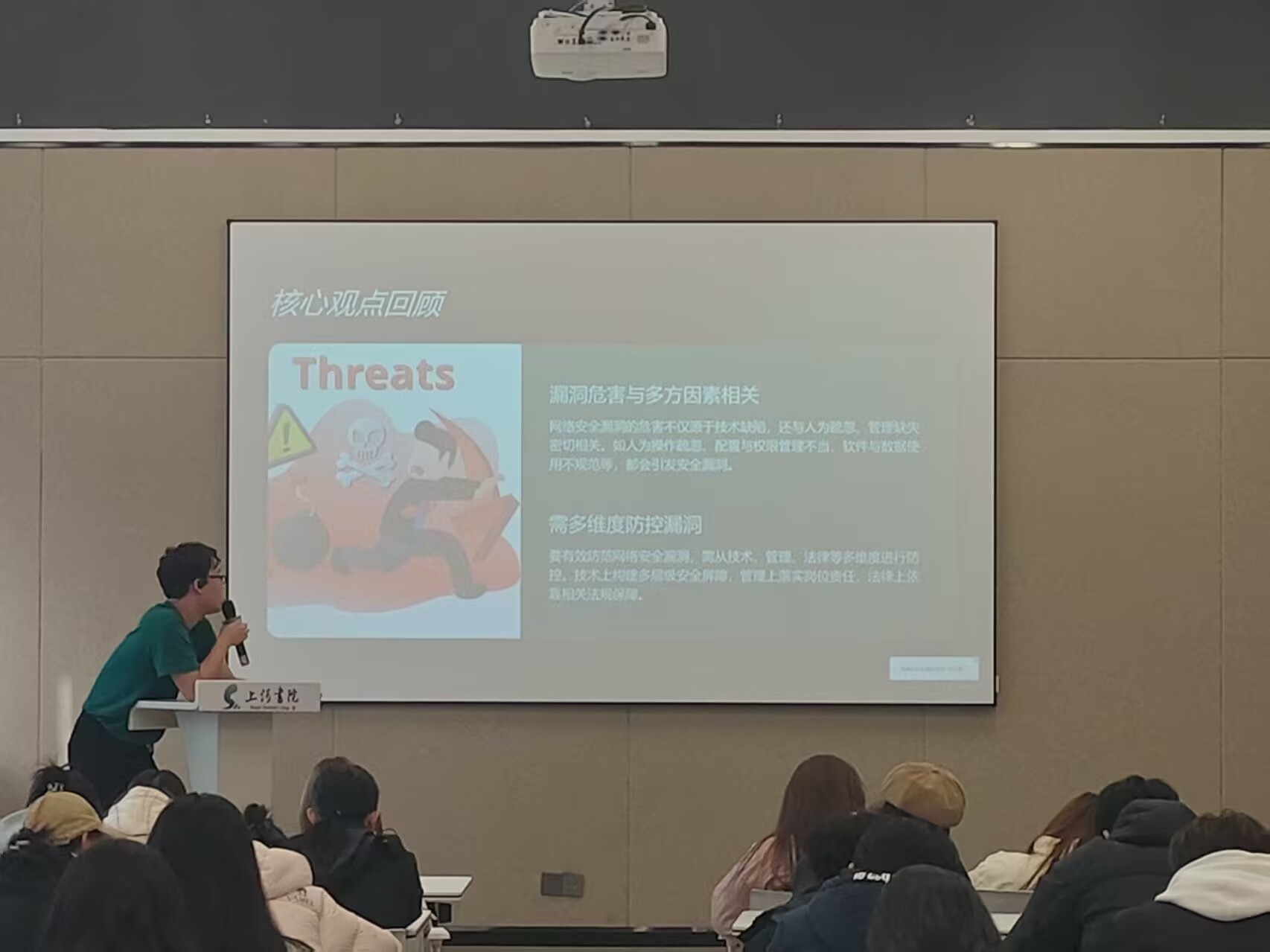 “我们每天都在与漏洞擦肩而过。”社长开场即指出网络安全与日常生活的紧密联系。他从学生最熟悉的校园网登录、手机APP使用等场景切入,通过展示“密码未加密传输”等真实案例,让学生们恍然大悟:原来网络安全漏洞并非遥不可及的技术概念,而是潜伏在每个人的数字生活中。现场不少学生立即低头检查自己的手机设置,这种即时的互动反应充分体现了科普内容的实用价值。