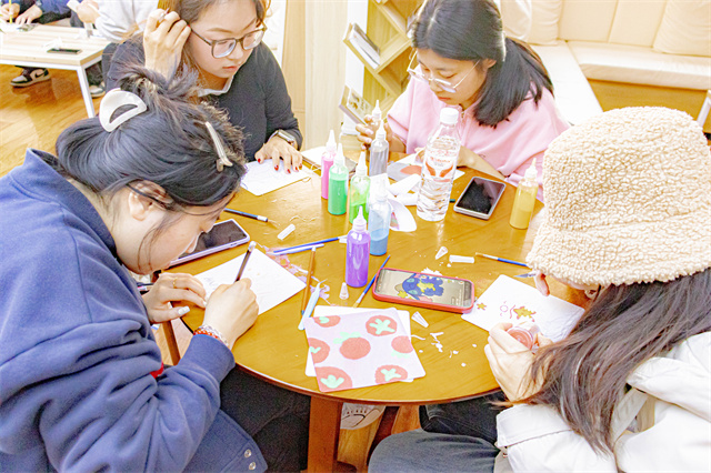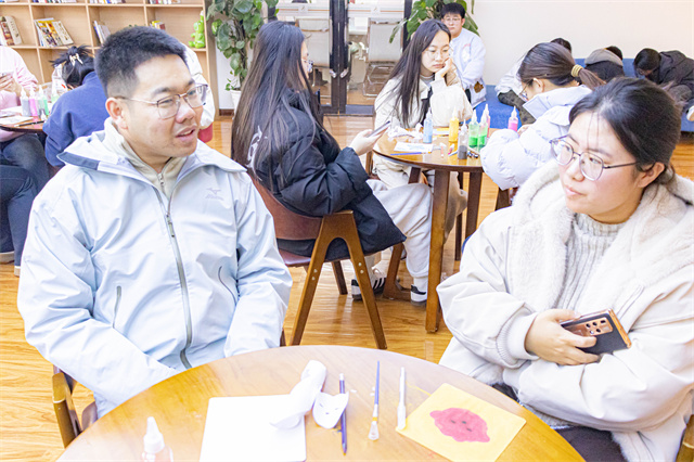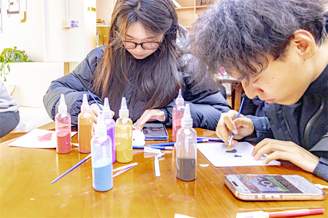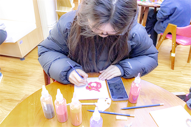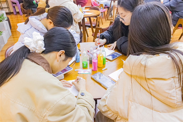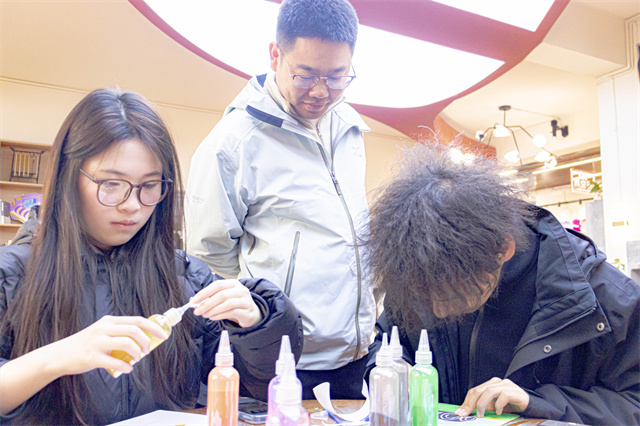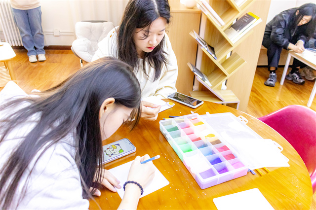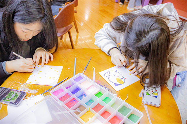 创作时,学生们低头专注于眼前的卡纸,时而微调沙粒的分布,时而拿起手机比对自然图片的细节。刘晓雄老师走到学生身边,拿起一张半成品说:“把你看到的自然,用沙粒讲出来就好。”“艺术不是‘复制’自然,而是用沙粒的质感‘翻译’自然的心跳。”围坐的学生们时而低头专注“播种”沙粒,时而举着作品与同伴碰出灵感,桌上的画笔、沙瓶与半成品卡纸,成了一间流动的“自然画室”。