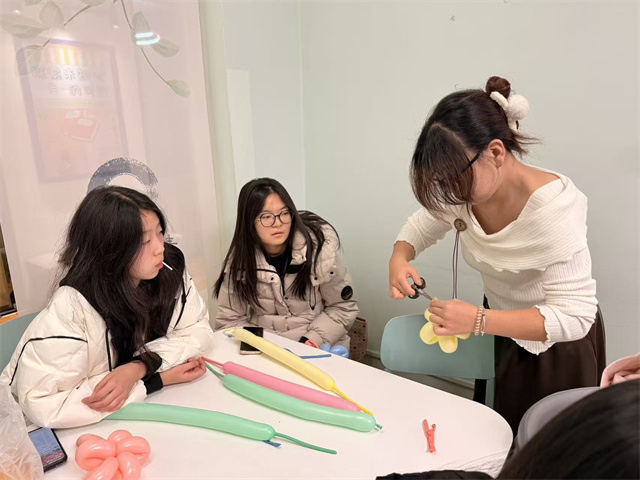 创作环节中,同学们悄然完成从“新手”到“巧手”的蜕变。活动伊始,教学以“理论讲解+现场实操”相结合的方式展开,条理清晰、循序渐进。讲解者手持长条气球,细致示范每一个关键步骤:“充气时需控制力度,七分满为宜,既保证造型空间,又避免因张力过大而破裂。每圈力度保持均匀,就能塑造出规整而富有美感的花朵。”一招一式,精准而富有节奏,将技艺的要领娓娓道来。整个教学过程不仅传授了气球编织的技巧,更在潜移默化中锤炼着同学们的专注力、手眼协调能力与审美感知。小小的气球在指尖流转,不仅是形态的蜕变,更是耐心与创造力的生动具现。这场指尖上的艺术实践,不仅让美育落地生根,更以可触、可感、可创的方式,为校园美育注入了鲜活而深刻的实践内涵。