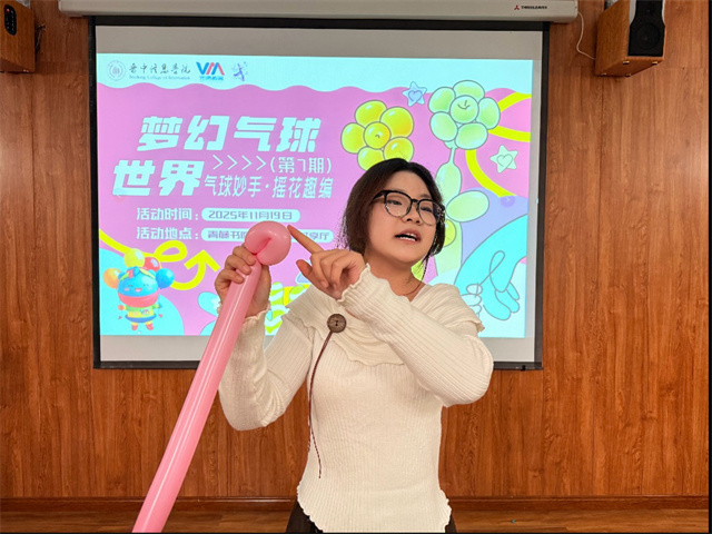 11月19日晚上,晋中信息学院青藤书院101青藤·共享厅流光溢彩,暖意融融。为深入推进校园美育实践,激发学生的动手潜能与创新思维,气球造型协会发起“气球妙手·摇花趣编”气球编织主题活动,于温馨夜色中温情启幕。来自全校各院系的近百名手工爱好者齐聚一堂,以指尖为笔,以气球为墨,将一根根普通的长条气球幻化成一朵朵灵动俏皮的手摇花。在专注的编织与创意的流淌中,大家沉浸于手工艺术的独特魅力,感受美在指尖生长的力量,也为冬日的校园悄然添上一抹跃动而温暖的亮色。