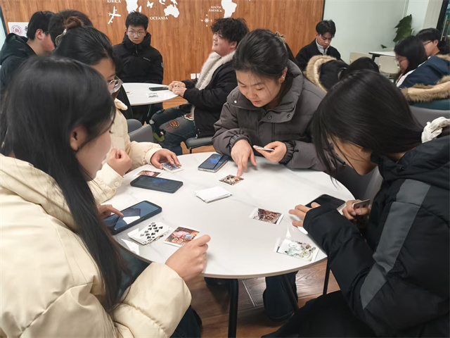 当核心博弈环节开启,四人成局,恰似群英汇聚,共赴一场智慧之约。纸牌之上,宛如开启了一扇通往晋商经营世界的大门,资源调度仿若精心调配的珍宝,市场博弈恰似在风云变幻的商海中探寻机遇,风险抉择犹如在迷雾中抉择前行方向。每一手出牌,皆需深思熟虑,仿若置身于晋商传奇岁月,权衡利弊;每一张技能卡,皆是命运赋予的变数,或为转机,或为挑战。同学们沉浸其中,于资源管理与策略博弈之间,领略“算无遗策”的高妙智慧,感悟“一着不慎,满盘皆输”的深刻哲理。现场笑语与思辨之声相映成趣,智慧与默契如琴瑟和鸣,共同奏响了一曲对晋商文化的赞歌。