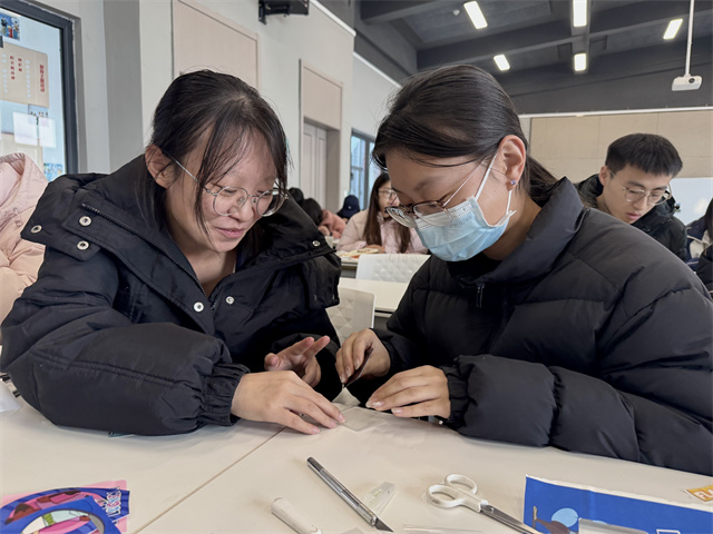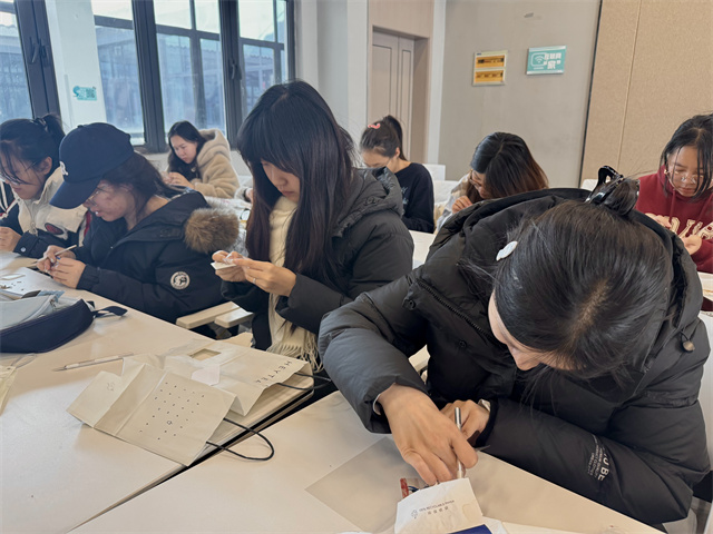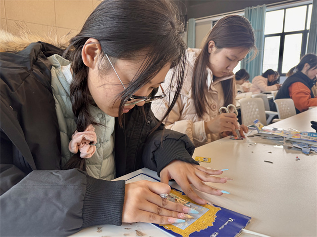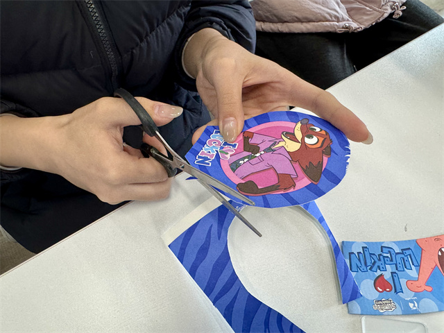 在现场,同学们惊喜地发现,那些曾被随手丢弃的纸袋,竟也能承载情绪、诉说心意,成为表达自我的独特载体:印着“半糖”的杯套被精心裁剪,化作一枚提醒健康生活的贴心冰箱贴,仿佛在轻声叮嘱日常的温柔;几片色彩各异的纸袋碎片,在巧思中被拼贴成一幅小小的抽象画,定格了某个慵懒惬意的下午茶时光,将瞬间的美好凝练成永恒。而沉浸于创作的过程,本身就是一场与自我的温柔对话——它悄然释放压力,如同一次治愈心灵的“大脑SPA”,在剪刀的轻剪、指尖的流转间,抚平焦躁,唤醒宁静,让心灵在专注中重获轻盈。