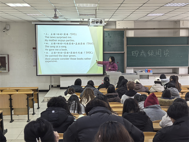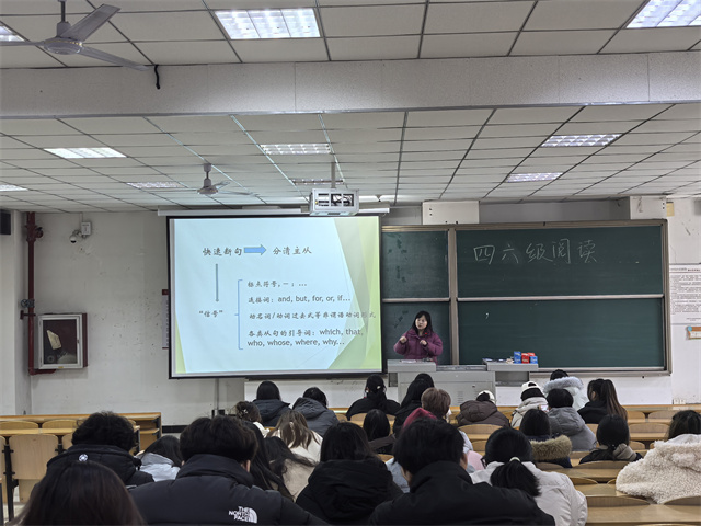 在四六级专题分享过程中,同学们全神贯注地投入到阅读题的学习中。葛老师深入剖析阅读题型的特点与解题技巧,大家紧跟老师的讲解节奏,沉浸于知识的汲取之中。当老师讲解如何快速定位关键信息时,同学们的眼中闪烁着求知的光芒。在互动环节中,大家积极提问,围绕长难句理解、时间把控等问题与老师展开了热烈的讨论。葛老师耐心地一一解答,并现场指导阅读练习,让同学们在实践中掌握了技巧,不仅提升了应试能力,更深化了对英语阅读本质的理解——阅读不仅是信息的获取,更是逻辑思维与语言素养的综合体现。这场分享,不仅传授了方法,更点燃了信心,让备考之路走得更加坚定而从容。