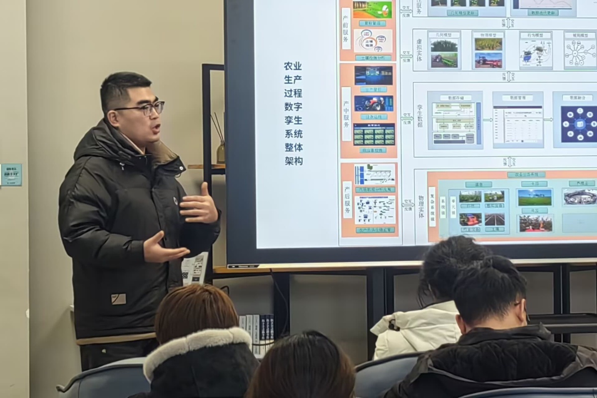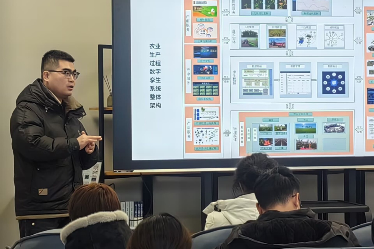 随后,张虎副教授以“数字孪生赋能智慧农业”为核心,带领同学们走进“物理世界与虚拟世界精准映射”的奇妙领域。他从数字孪生的核心定义展开:“数字孪生不是简单的3D模型,而是能反映物理实体全生命周期、实时状态和行为特征的动态系统——它就像给农田、温室、农机装上了‘数字镜子’,让我们能在虚拟空间里‘彩排生产’预判风险。”