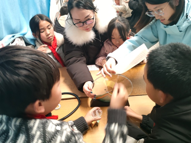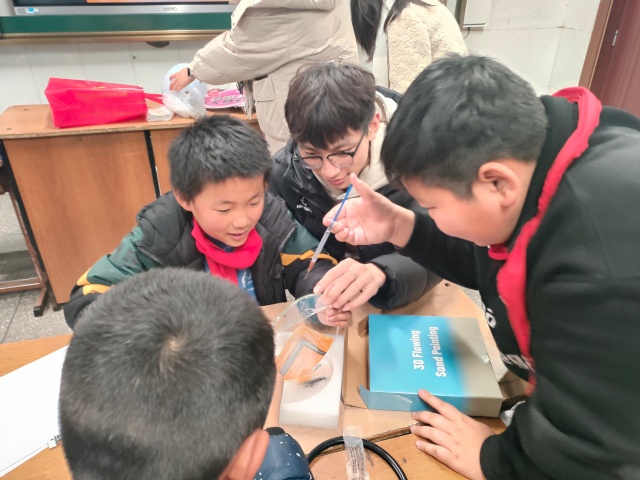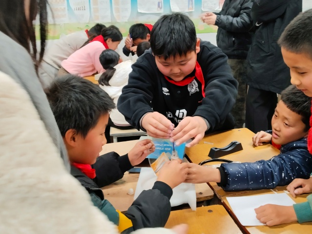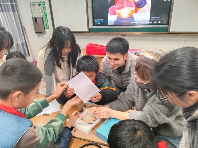 针对乡村留守儿童情感陪伴的需求,志愿者以同龄伙伴的身份围坐交流,开展一对一的心灵沟通。他们耐心倾听孩子们的内心想法,用温和的语言疏导孩子的情绪,缓解他们的羞怯与不安。在共同制作3D立体流沙画,五彩细沙在透明相框中铺展成型,寄托着对远方的期许与对家乡的热爱;双方还一同制作安全知识粘贴手作,将“交通安全记心间”“用电防火莫大意”等安全要点融入手工创作,让安全认知以具象的形式被理解。