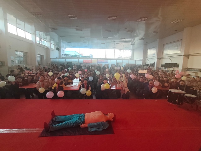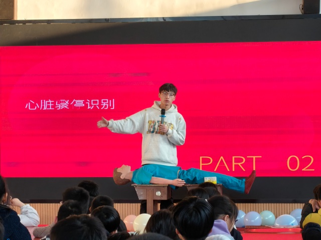 “有人突然倒地该先做什么?”“同学进食呛咳该如何施救?”面对提问,同学们纷纷举手回应,现场互动氛围热烈。志愿者结合实际案例,用通俗的语言讲解心肺复苏(CPR)的操作流程、自动体外除颤器(AED)的使用规范,以及海姆立克急救法的原理与操作步骤。