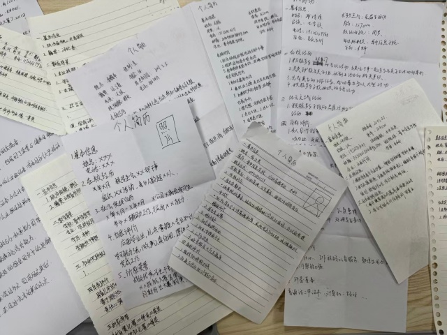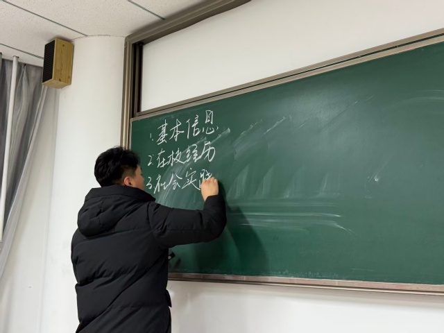 技巧讲解结束后,现场随即开展了个人简介动手撰写实践环节。同学们纷纷拿出纸笔,结合刚学到的撰写技巧,梳理自身经历,勾勒简历框架。过程中,大家时而低头沉思梳理过往,时而提笔记录核心亮点,遇到困惑时便主动向解老师请教。解老师穿梭在同学们之间,逐一审阅大家的初稿,针对每个人的情况给出个性化修改建议,小到措辞打磨,大到结构调整,都耐心细致地指导,帮助同学们把理论技巧转化为实际的写作能力。现场学习氛围愈发浓厚,动手实践让同学们对撰写要领有了更深刻的掌握。