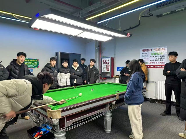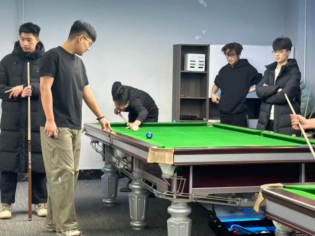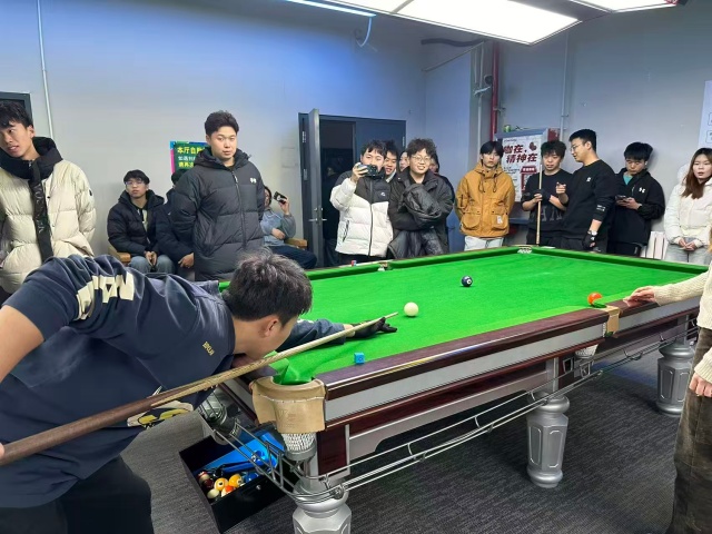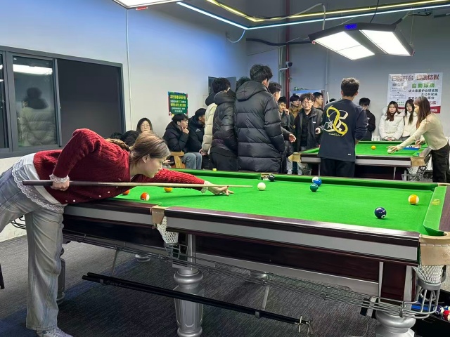 球杆轻扬破局而出,彩球碰撞激荡青春!12月24日下午,晋中信息学院“杆潮来袭,青春撞不停”中式八球友谊切磋活动在晋星台球俱乐部开展。校内台球爱好者齐聚一堂,以球杆为媒、策略为策,于方台之间展开技艺切磋,用专注与热爱书写青春竞技篇章。这场专属校园台球爱好者的交流盛会,既是精准与谋略的交锋,更是友谊与成长的交融,参加者们以沉稳为底气、交流为桥梁,尽情展现当代大学生的专注姿态与运动风采。