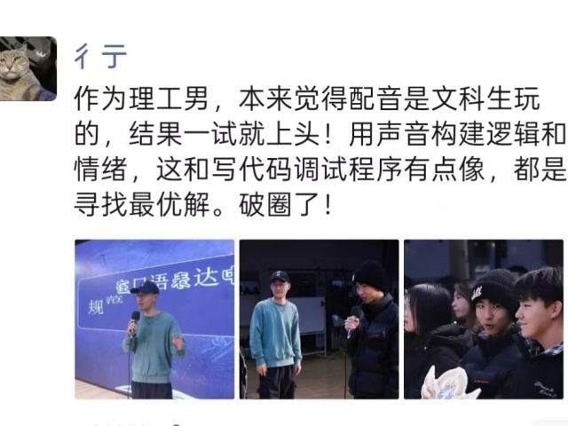 信息工程学院一同学:“作为理工男,本来觉得配音是文科生玩的,结果一试就上头!用声音构建逻辑和情绪,这和写代码调试程序有点像,都是寻找最优解。破圈了!”