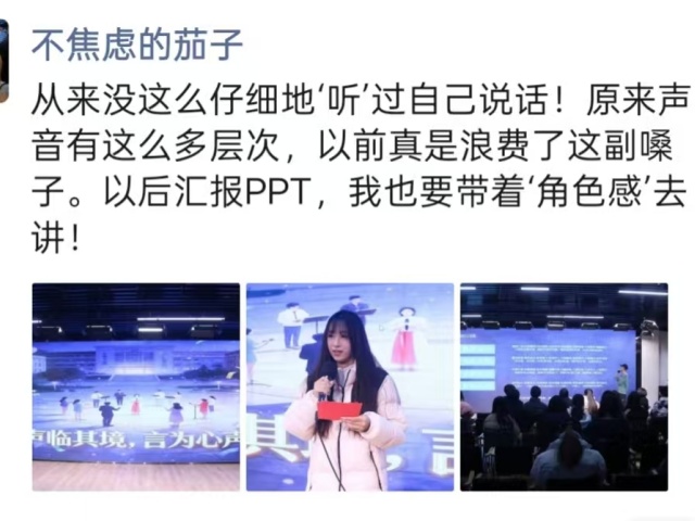 商务英语学院一同学:“从来没这么仔细地‘听’过自己说话!原来声音有这么多层次,以前真是浪费了这副嗓子。以后汇报PPT,我也要带着‘角色感’去讲!”