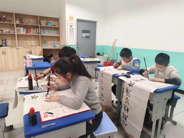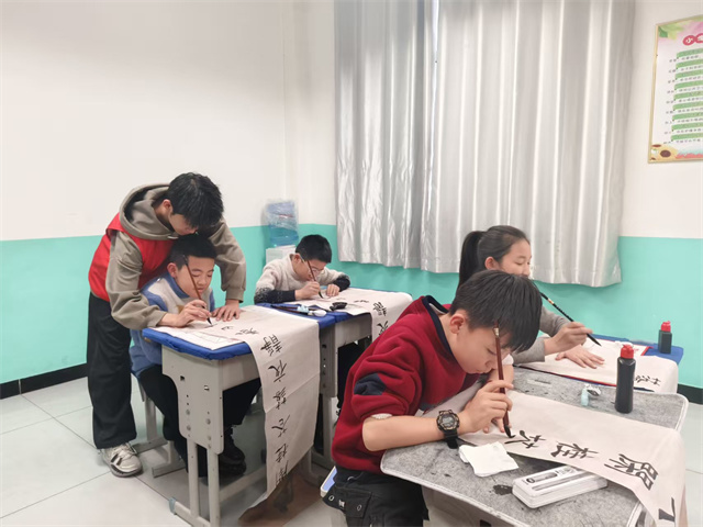 伏案挥毫间,专注的神情写在每一张稚嫩的脸庞上。孩子们反复推敲起笔的角度,或是不满意便轻轻擦拭重来,力求呈现最佳效果。当一幅幅稚拙却工整的作品跃然纸上,眼中闪烁的是完成作品的喜悦和自信。从握笔颤抖到落笔沉稳,从辨识笔画到独立创作,笔墨间的每一次蜕变,都是心性磨砺与文化浸润的见证。这不仅是技艺的习得,更是在孩子们心中播下了一颗静气与定力的种子,让传统文化的传承在这一笔一划的深耕中真正落地生根。