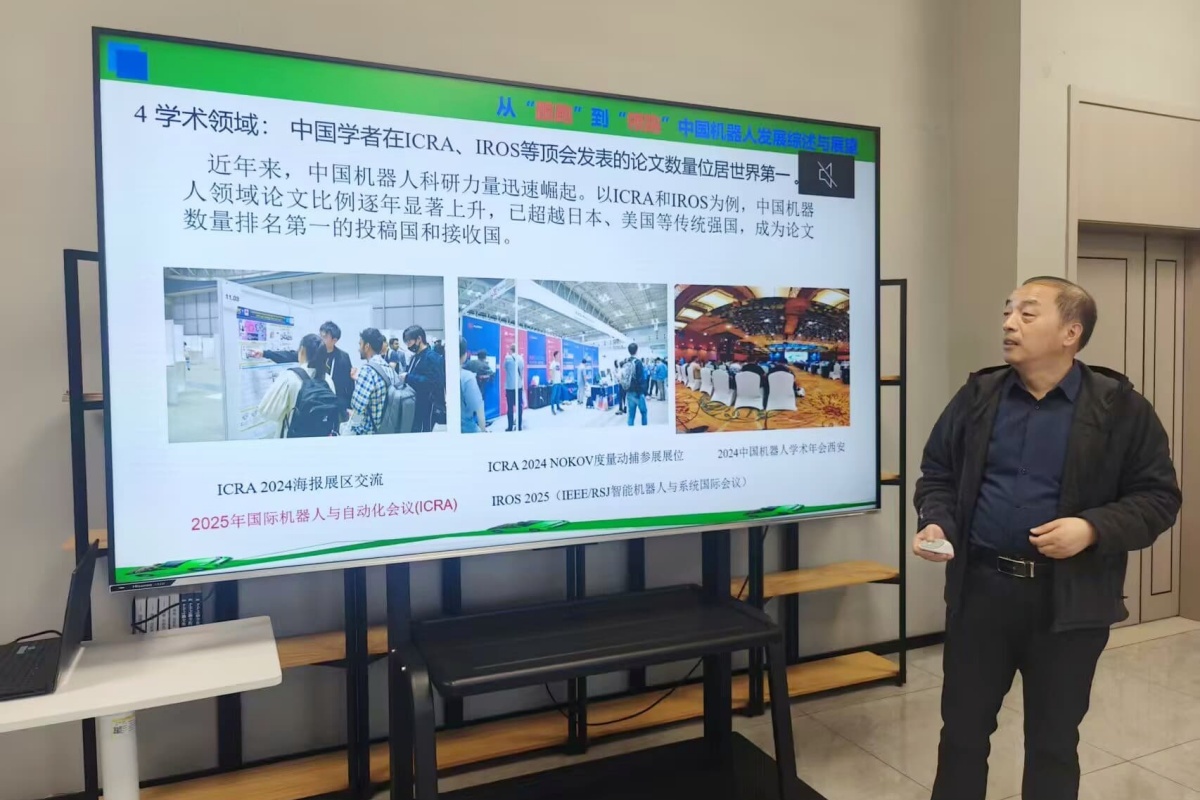 傅建平副教授以《从“跟跑”到“领跑”——中国机器人发展综述与展望》为题,娓娓道来中国机器人产业的成长之路。从基础概念的科普到产业成果的展示,从技术跨越的突破到未来机遇的展望,他用生动案例拆解机器人技术的核心逻辑,梳理中国机器人从模仿学习到自主创新的发展脉络。在谈及产业挑战时,他聚焦核心芯片、数据安全与伦理治理等关键议题,引导学子思考技术与伦理的平衡之道;在面向同学的互动环节,他鼓励不同专业背景的同学跨界融合,强调“跨界学习能力”是未来科技人才的核心素养,让在场学子深受启发。