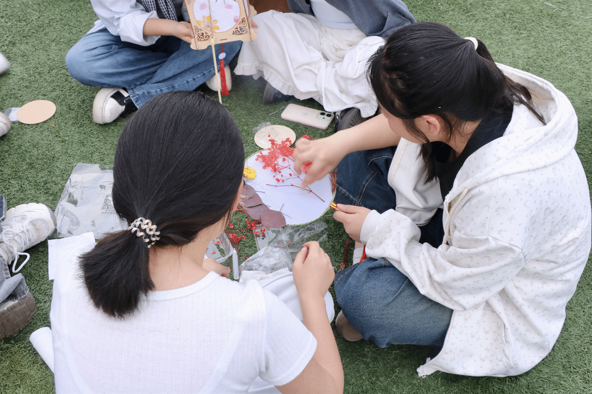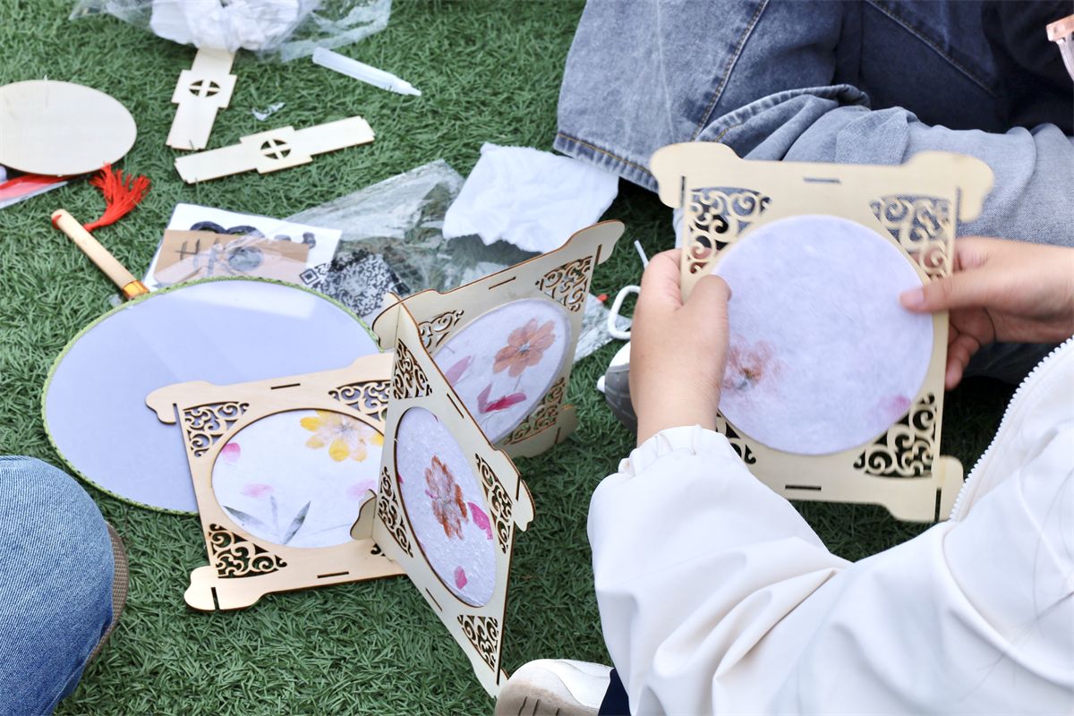 参与者以6-8人为一个创作小队,领取团扇与花灯DIY专属材料,开启春日主题文创创作之旅,以春日自然意趣为创作内核,裁纸描春、晕色赋形,将枝头新绿、花间春意、春日情思融入手工创作,指尖流转间尽显审美巧思与动手功力。从纹样设计到细节雕琢,从团队协作到作品成型,一把把兼具美学与创意的团扇、一盏盏承载春日希冀的花灯次第呈现,传统手工艺的文化底蕴与青年学子的创新思维完美交融,让春日诗意在文创作品中定格。