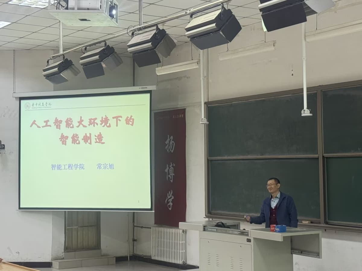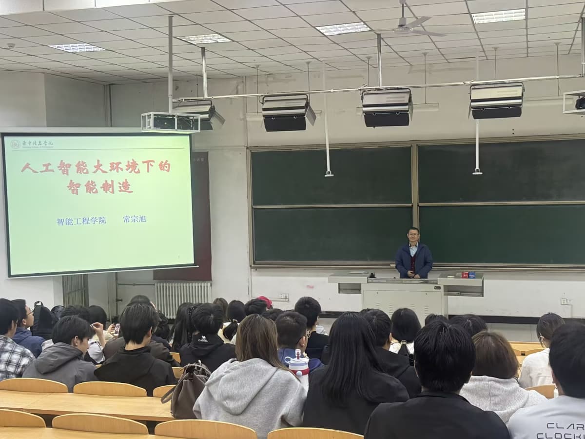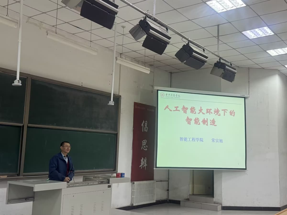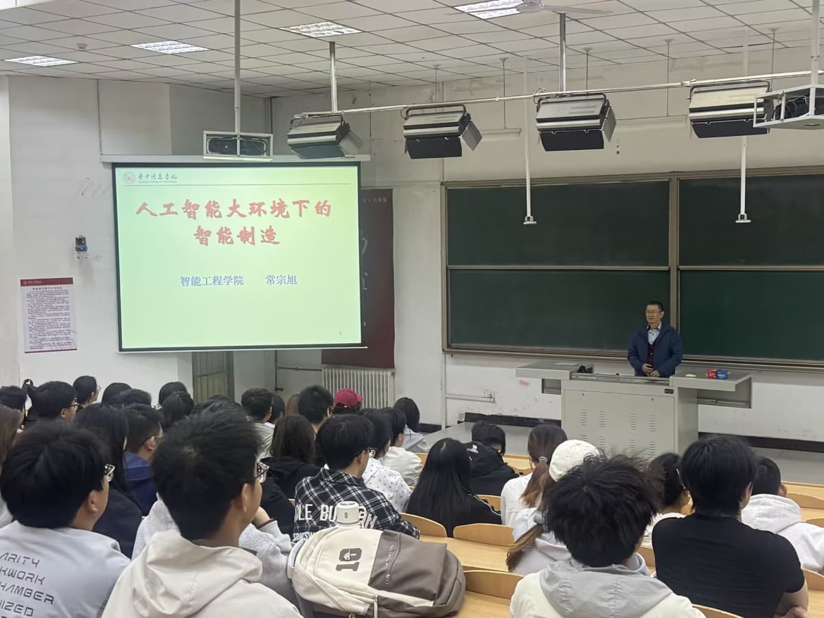 当齿轮的咬合声与代码的运行声交织,当传统制造的厚重底蕴遇上人工智能的澎湃浪潮,一场关于产业革新的思想碰撞,正在悄然发生。4月21日晚上,由智能工程学院团总支社团管理部主办的“人工智能大环境下的智能制造主题讲座”在博学楼203教室开展。本次讲座特邀常宗旭教授主讲,以“智能生产·技术创新·产业升级”为脉络,为到场学生揭开智能制造的神秘面纱,勾勒出数字时代制造业转型的清晰轮廓。